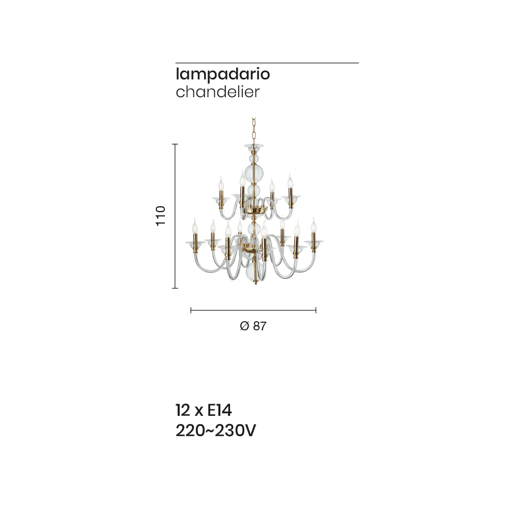 إن الروح النبيلة والمغرية لهذه الثريا المكونة من 12 ضوءًا لا تترك مجالًا للتردد: فشخصيتها الحاسمة والحاسمة ستصبح بطلة المشهد، لغرفة معيشة أنيقة أو غرفة نوم ملكية . مثالية لأولئك الذين يريدون إضاءة سينوغرافية بأسلوب الأوقات الماضية، تصميمها الكلاسيكي والفاخر يتكون من كرات موضوعة واحدة فوق الأخرى لجسم الضوء، والتي تسمح بإلقاء نظرة خاطفة على قلب المعدن الذهبي، ومن 12 ذراعًا مقوسة، مصنوعة بالكامل من الزجاج المصنوع يدويًا ومتوفرة في ظلال أنيقة مختلفة، لتناسب تمامًا أي مكان وتلبية احتياجات مختلفة.