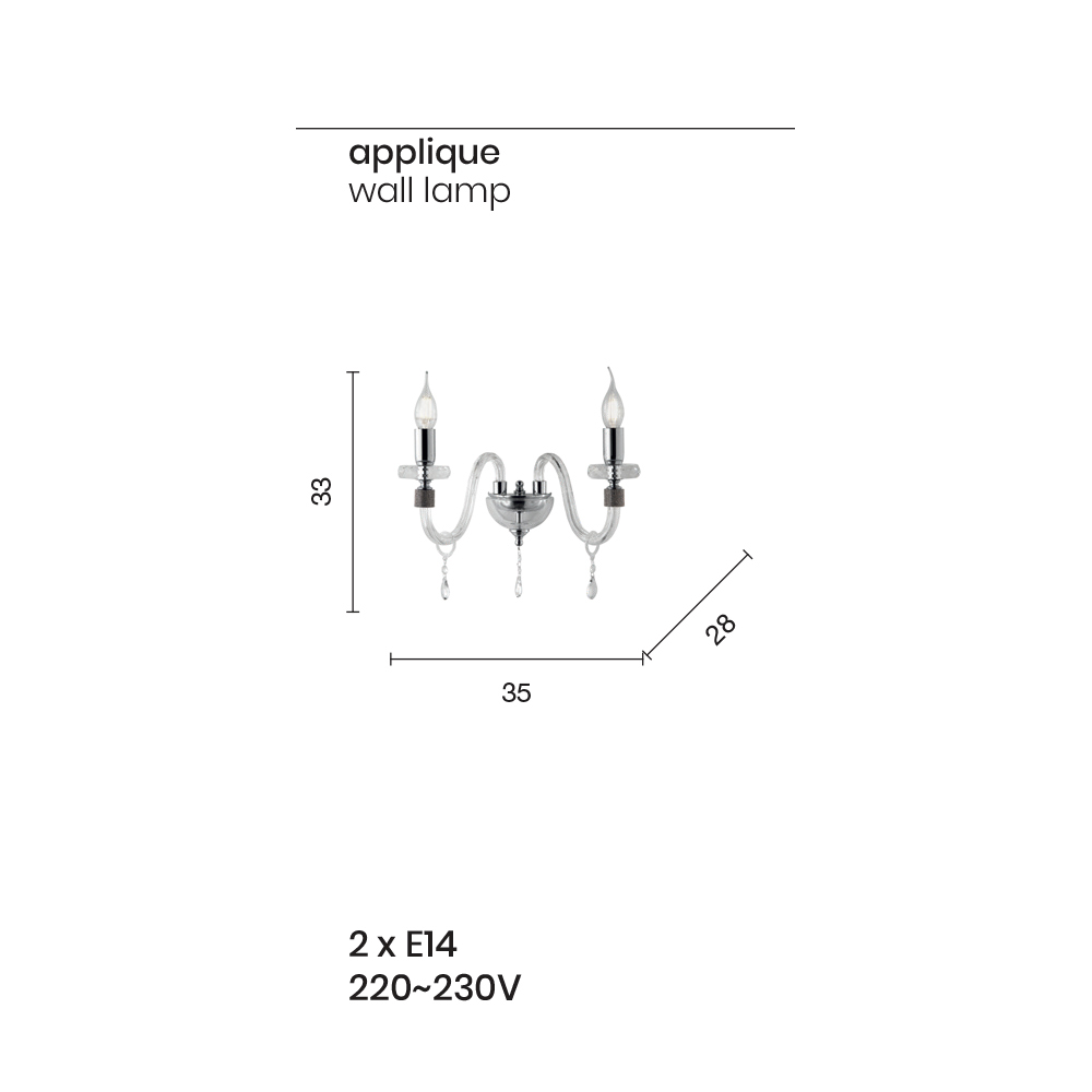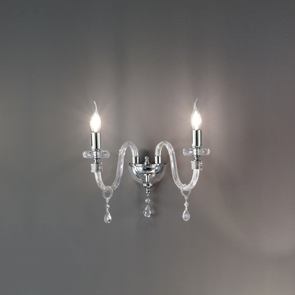 يتكون هذا المصباح الجداري ذو الطراز الكلاسيكي من ذراعين مقوستين مصنوعتين من الزجاج الشفاف المصنوع يدويًا في إيطاليا بتأثير "rigaton"، ويحيط نهايتها بريق مثبت في المعدن، بالإضافة إلى الجزء المركزي من المكمل، حيث يدعم قرصان دائريان أنبوبيان الهيكل المتخلل مع قرصين دائريين بأحجام مختلفة مصنوعين من الكريستال المقطوع.