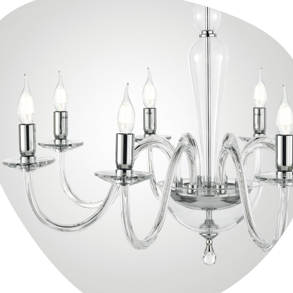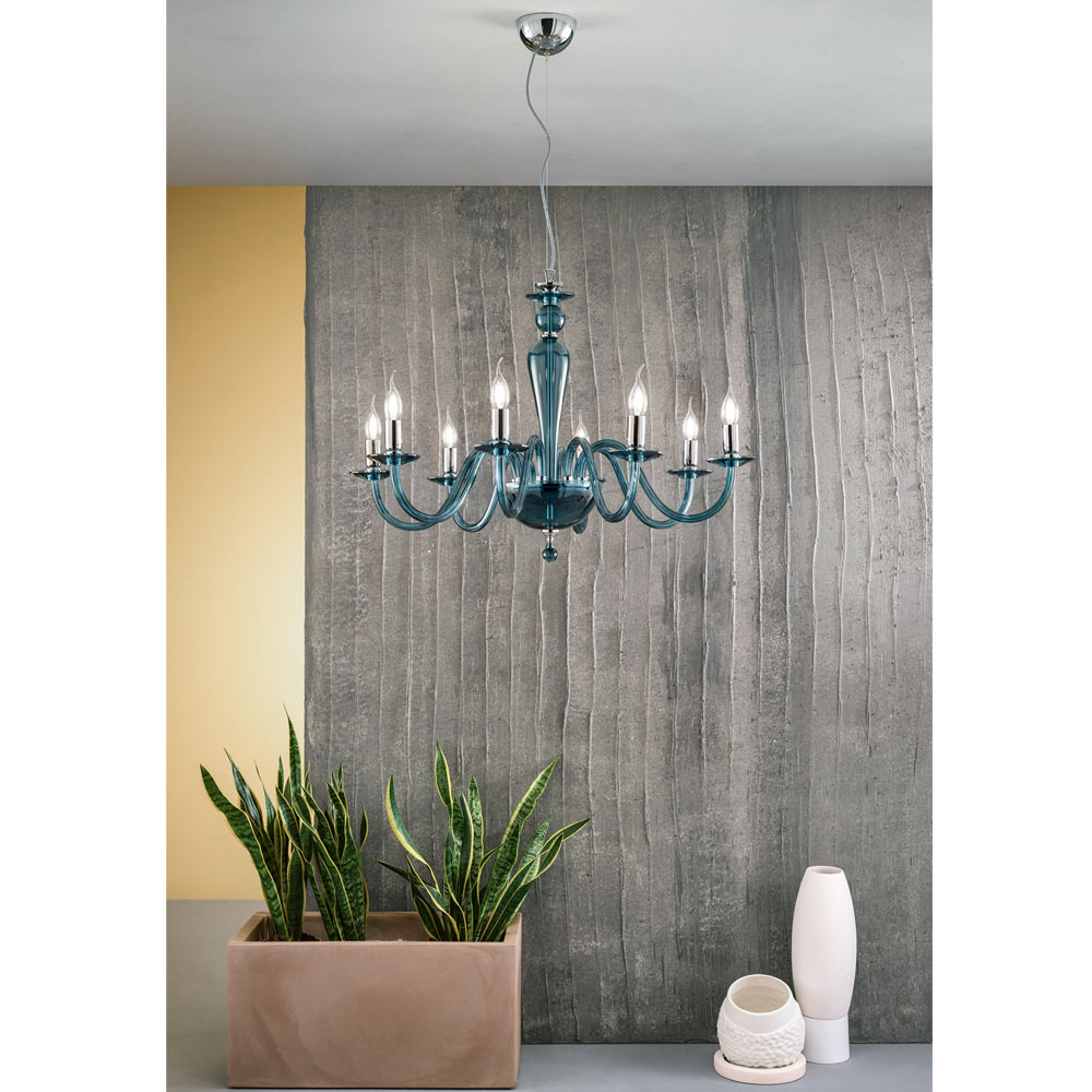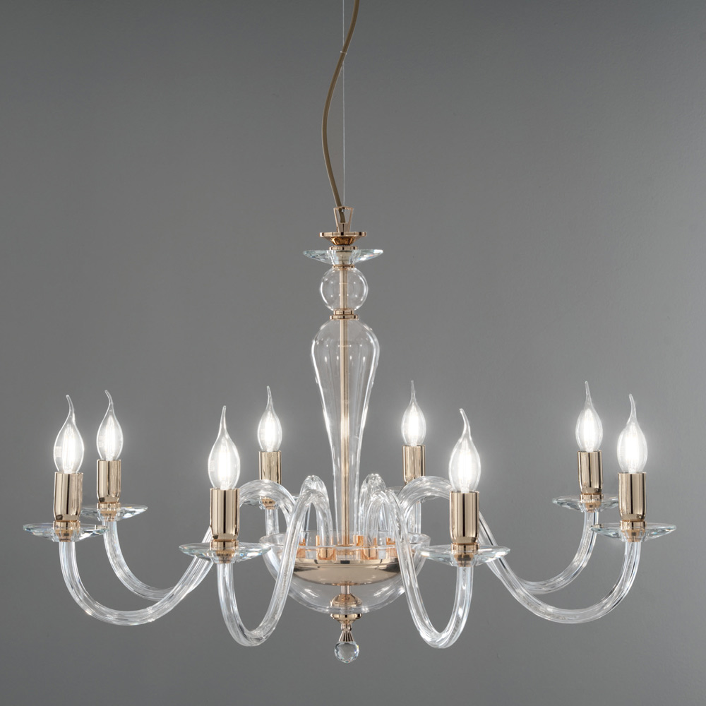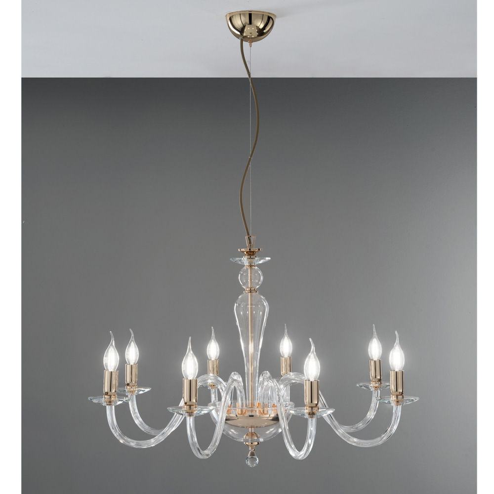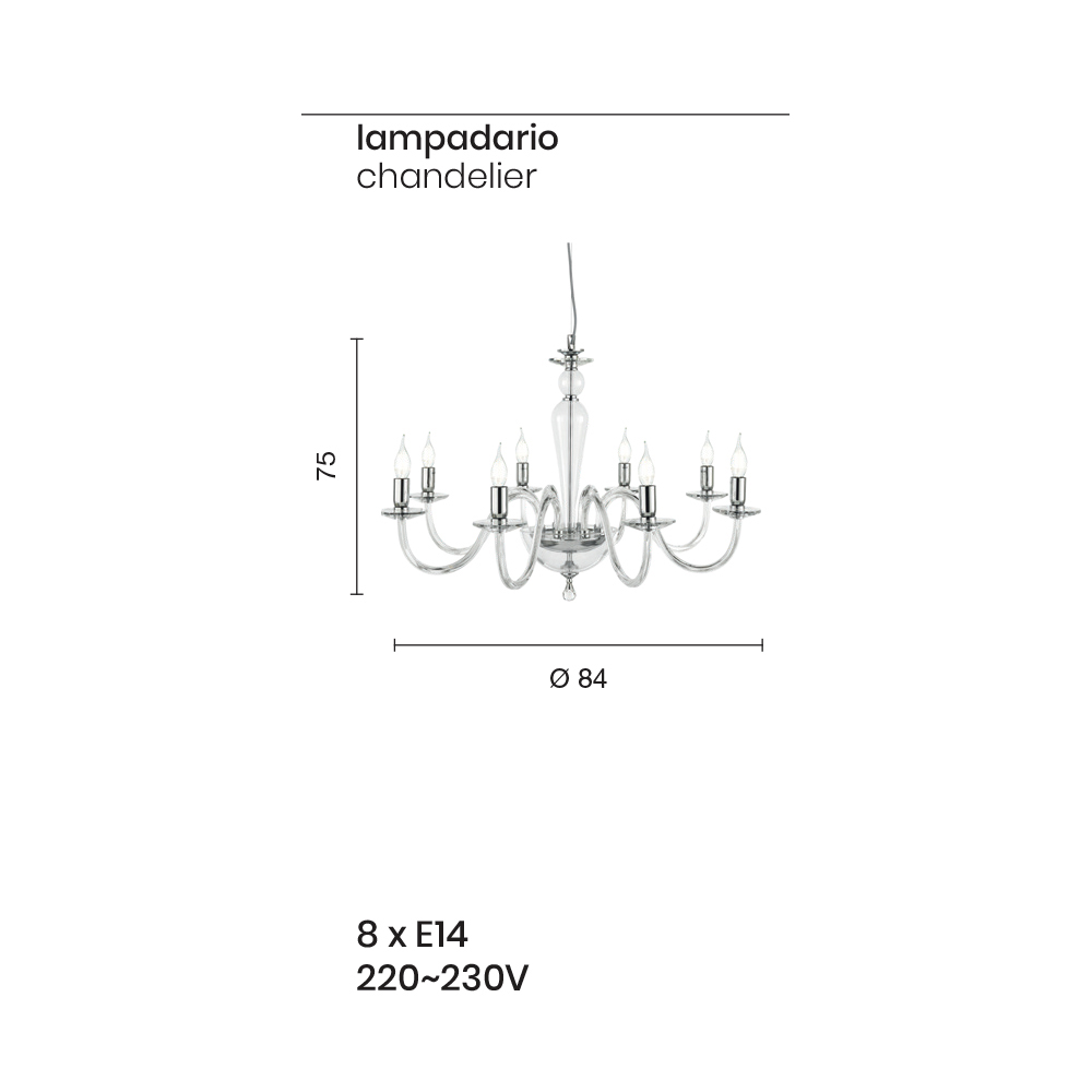 تتكون هذه الثريا ذات الطراز الكلاسيكي من 8 أذرع مقوسة مصنوعة من الزجاج المصنوع يدويًا في إيطاليا والتي تدعم الصحون التي تستضيف مصادر الضوء.