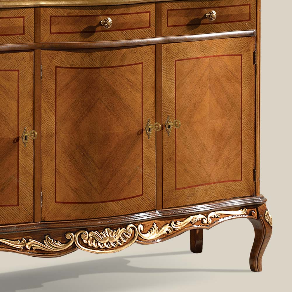 خزانة جانبية أنيقة لغرفة المعيشة بتصميم كلاسيكي، متوفرة من خشب فاخر بلمسة نهائية من خشب جوز باسانو مع تفاصيل ذهبية عتيقة، أو باللون الأبيض مع تفاصيل فضية. تحتوي الخزانة الجانبية على ثلاثة أدراج وثلاثة أبواب. أنيقة وعصرية، هذه الخزانة الجانبية الكلاسيكية مثالية لخلق أجواء رائعة، بفضل تفاصيلها الفريدة. مصنوعة يدويًا بالكامل في إيطالياعلى يد حرفيين مهرة ، بلمسة من الحكمة والذوق الرفيع. يتم الإنتاج باستخدام أجود المواد ، ويتم تنفيذ العمليدويًا بأقصى درجات العناية والاحترافية التي تميز المنتجات المصنوعة في إيطاليا .