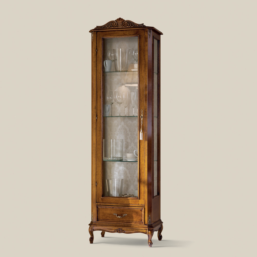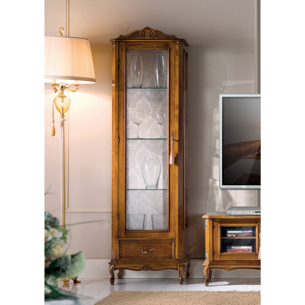 خزانة عرض كلاسيكية لغرفة المعيشة مصنوعة من خشب الجوز مع باب واحد صنع في إيطاليا.