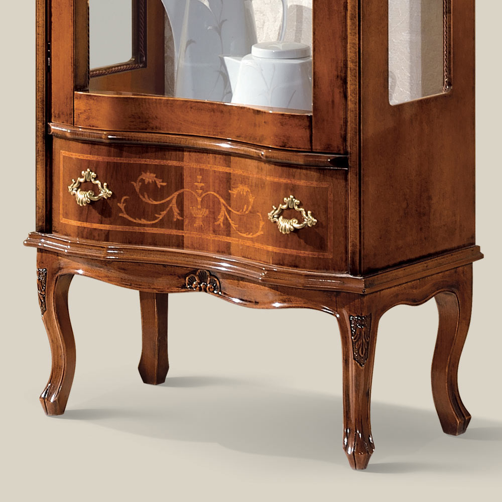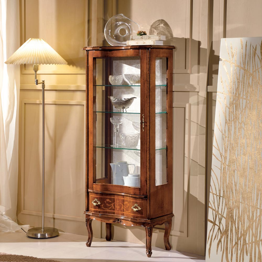 خزانة عرض كلاسيكية لغرفة المعيشة مصنوعة من خشب الجوز مع باب ودرج صنع في إيطاليا.