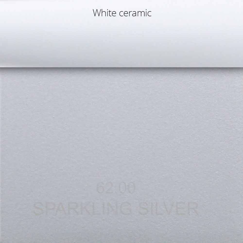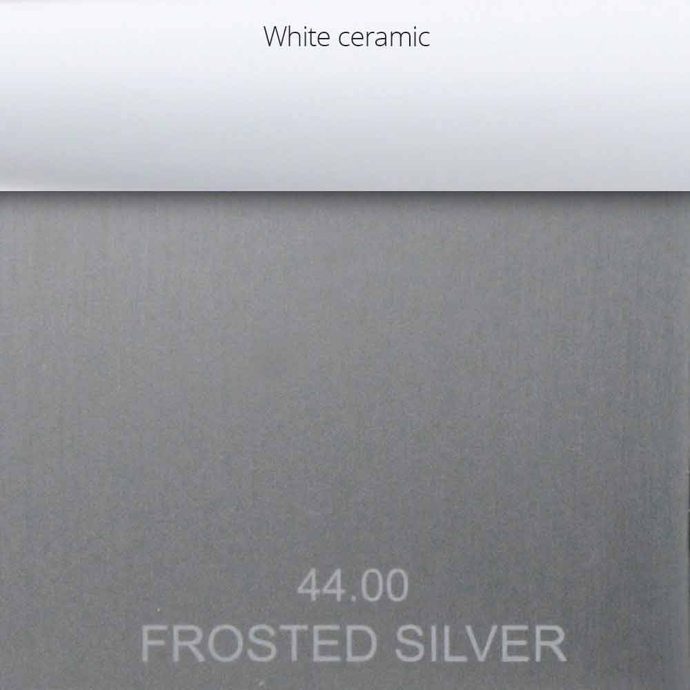 فضي لامع: لمسة نهائية معدنية فضية غير لامعة مع لمسات سيراميك بيضاء على المقابض؛