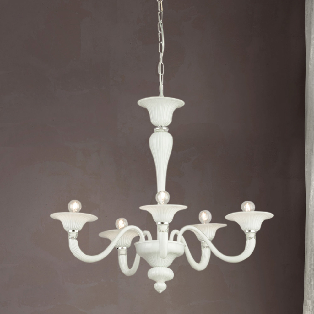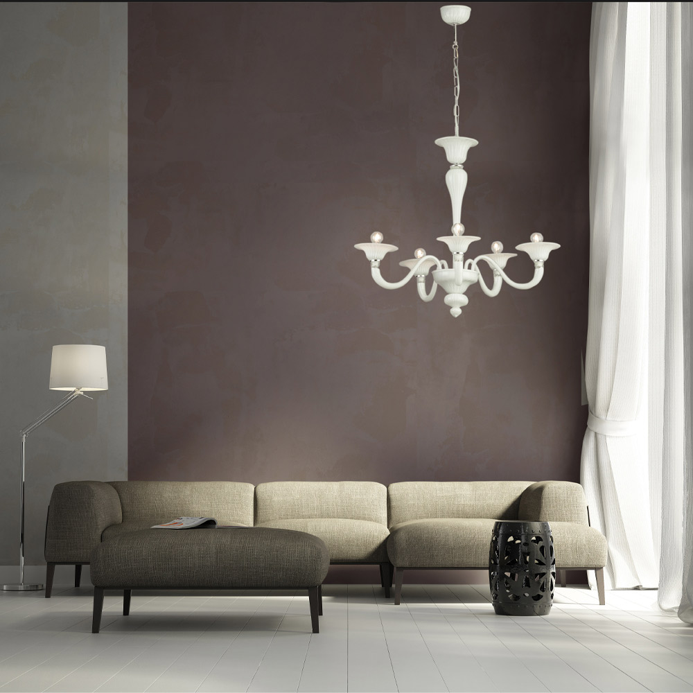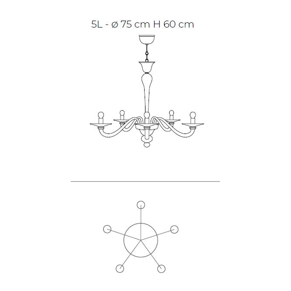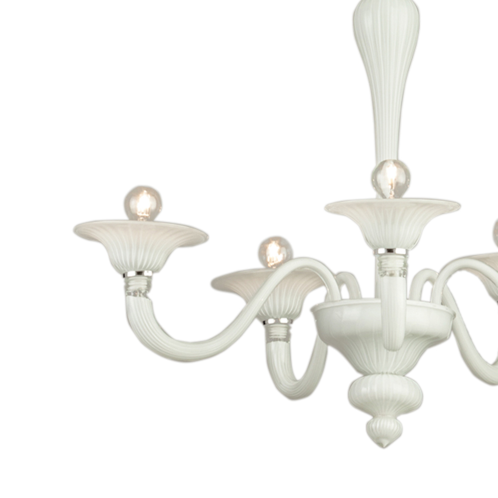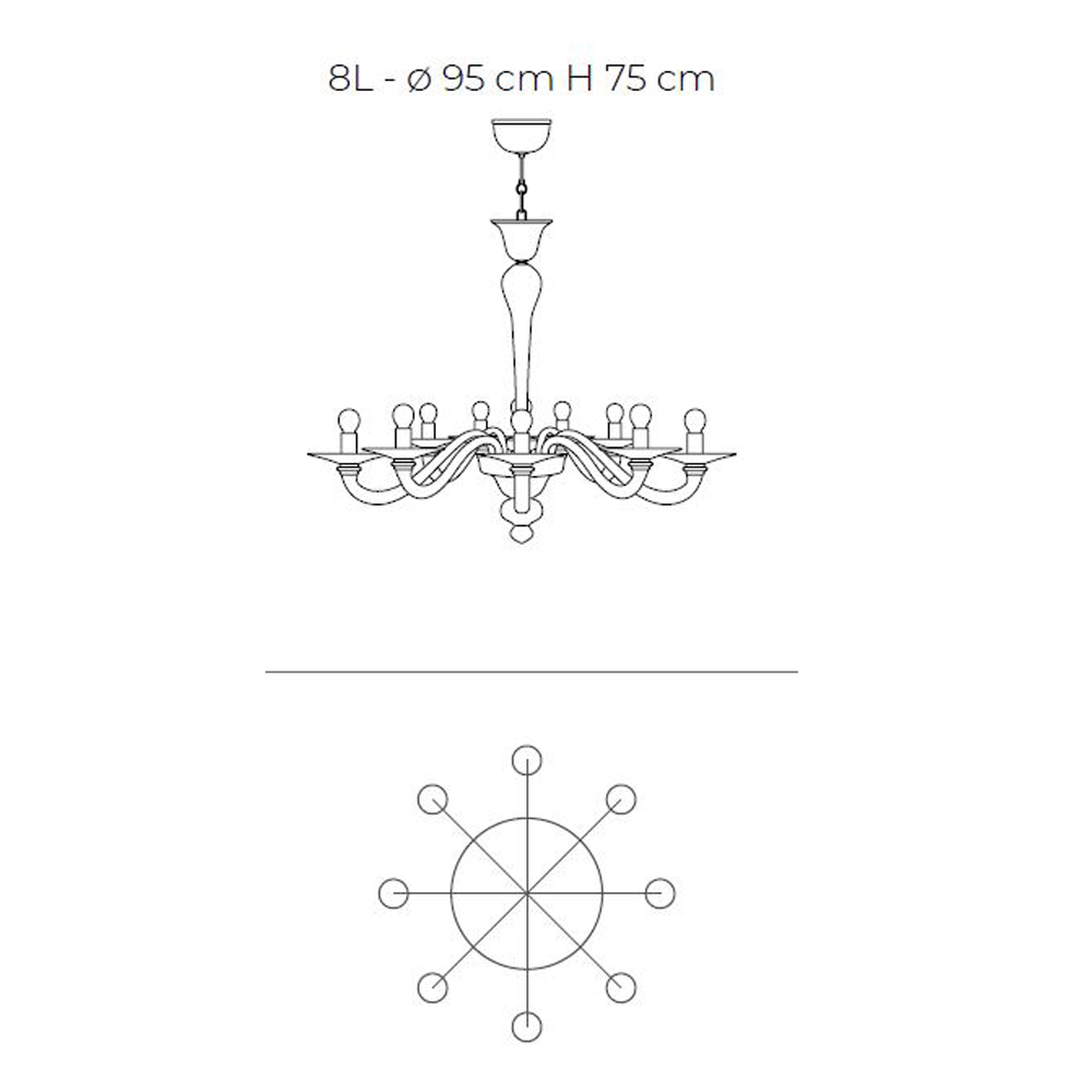 ثريا على الطراز الكلاسيكي مصنوعة يدويًا من الزجاج المنفوخ داخل أفران المناطق الداخلية لمدينة البندقية، في إيطاليا، من خلال استخدام تقنيات معالجة زجاج مورانو القديمة التي توارثتها على مر السنين أمهر أساتذة الزجاج.