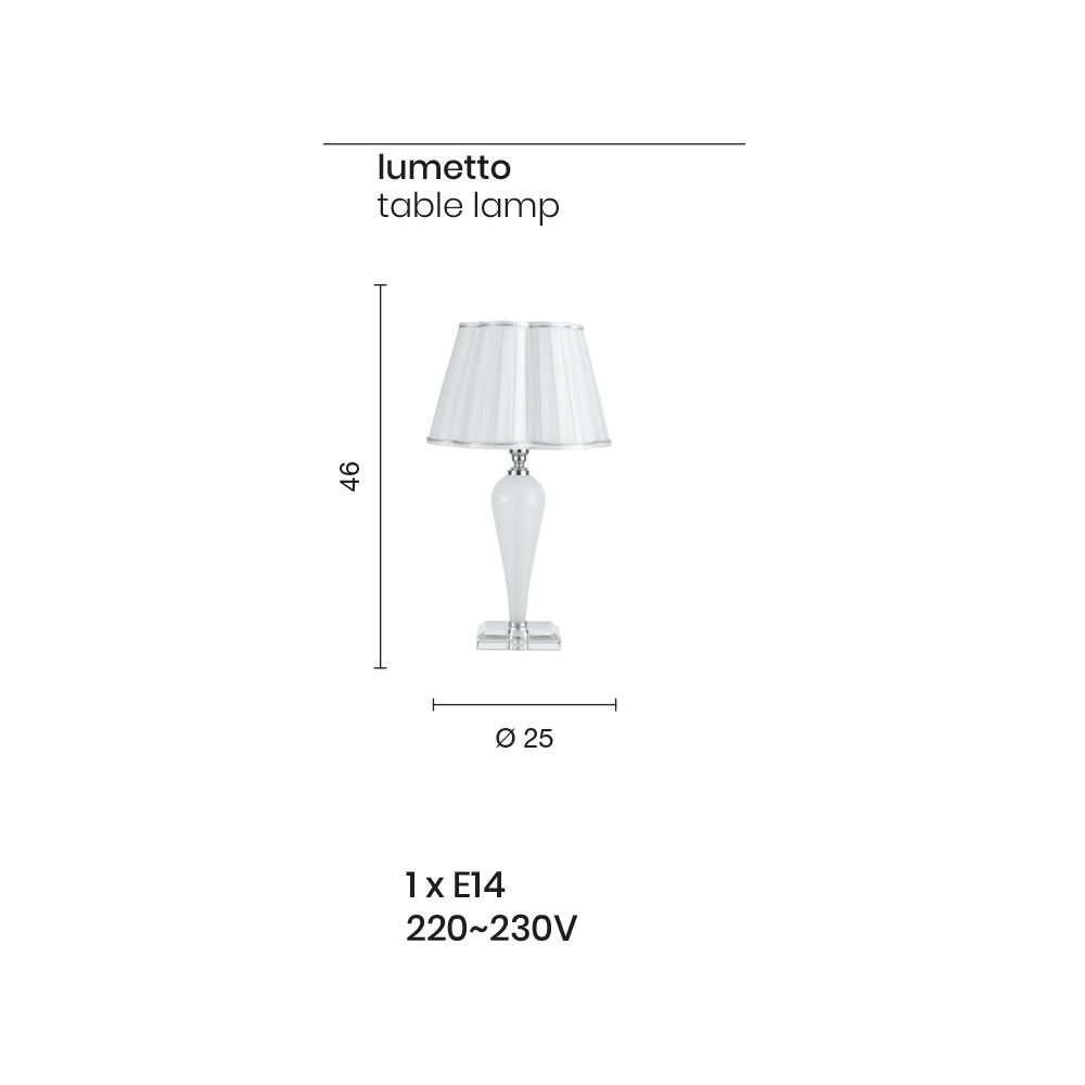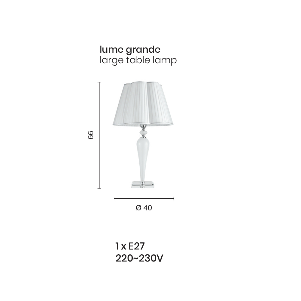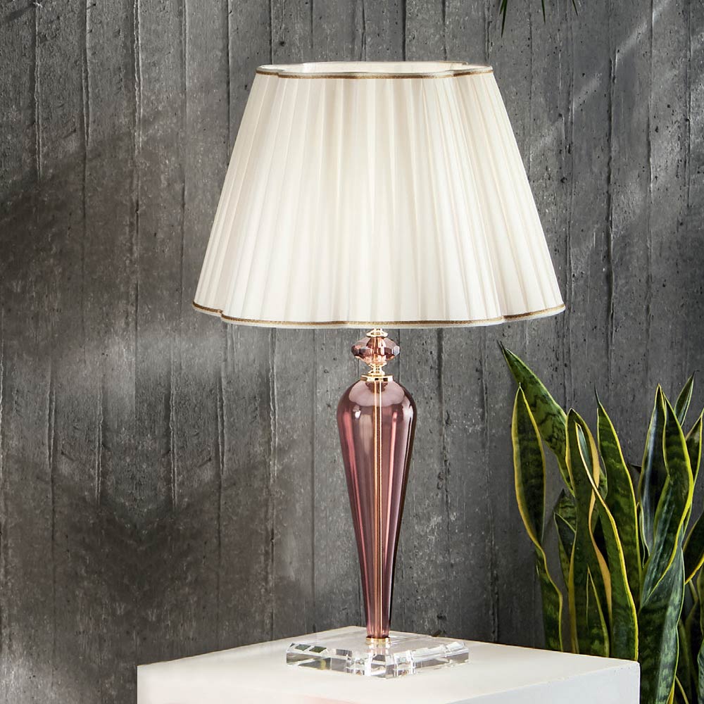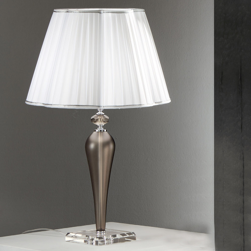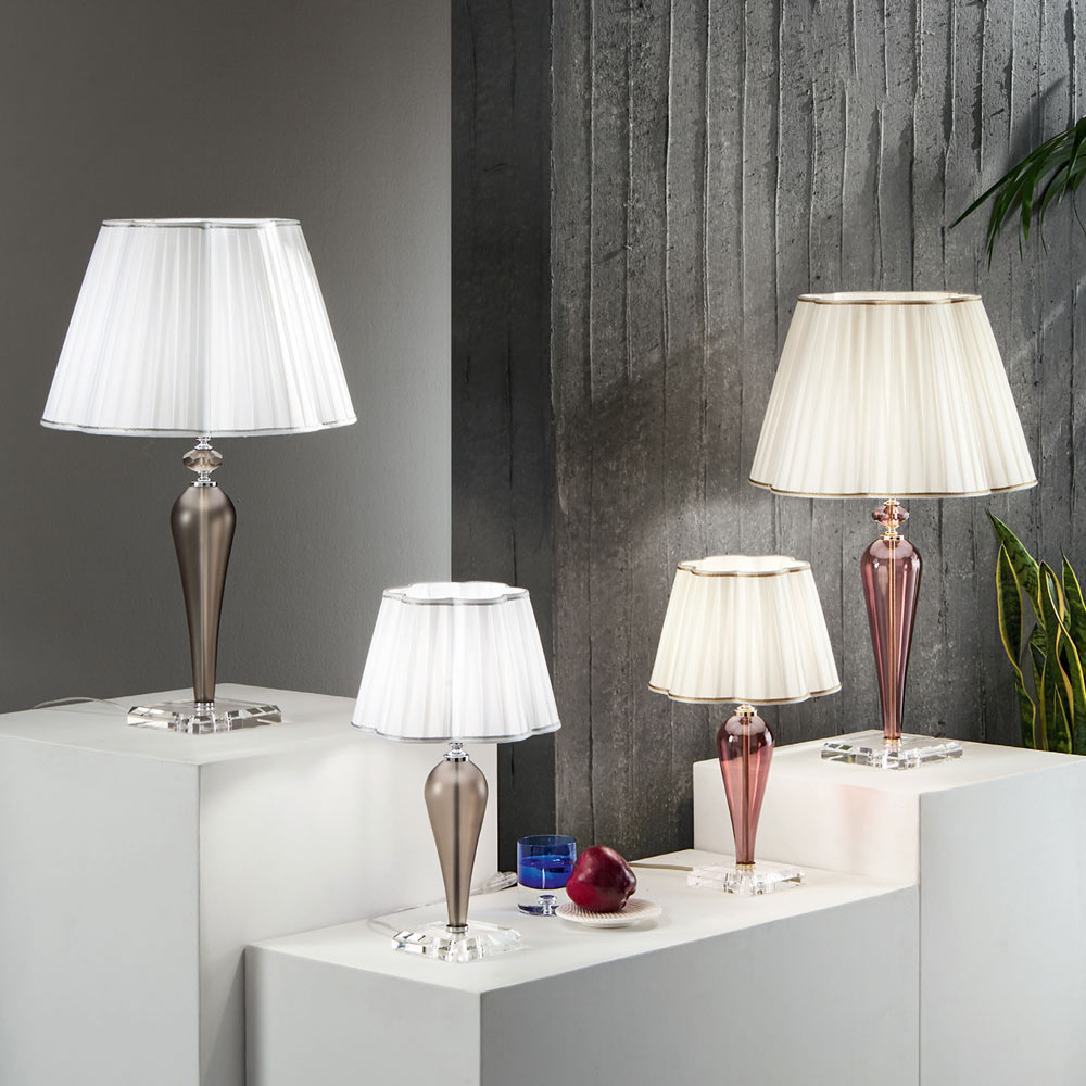 يتميز هذا المصباح المكتبيبتصميم كلاسيكي وراقي وأنيق، يتكون من قاعدة من الكريستال وعناصر أسطوانية الشكل مصنوعة يدويًا من زجاج يُشكل هيكل المصباح. التفاصيل الصغيرة وغطاء حامل المصباح مصنوعان من معدن مطلي بالكروم أو ذهبي ؛ بينما غطاء المصباح المُزخرف مصنوع من قماش أبيض بلمسات نهائية فضية أو ذهبية.
