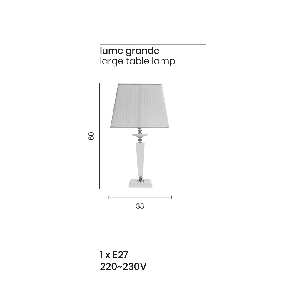 قادر على توصيف البيئة، يتكون مصباح الطاولة هذا من قاعدة مربعة بيضاء وعنصرين مربعي الشكل من الزجاج الأبيض المصنوع يدويًاوغطاء مصباح من القماش الأبيض بتأثير مطوي.