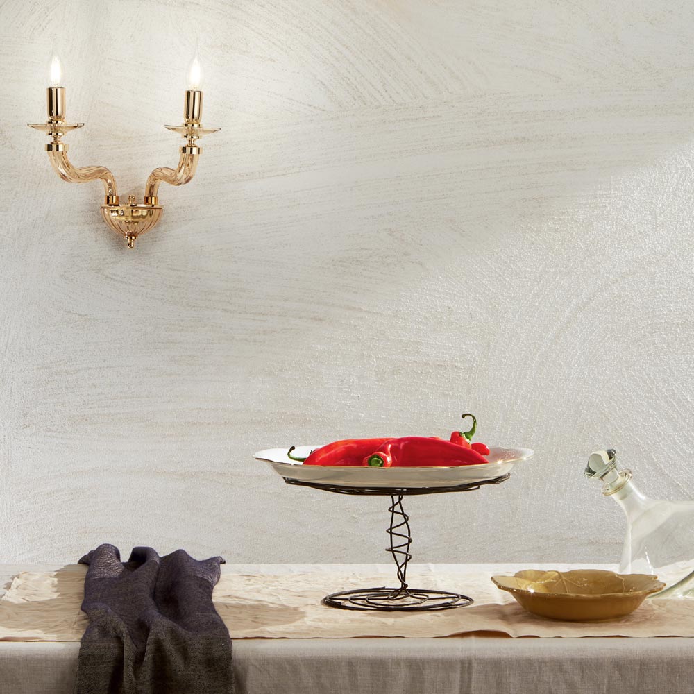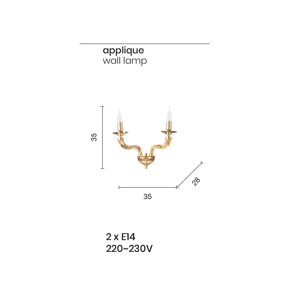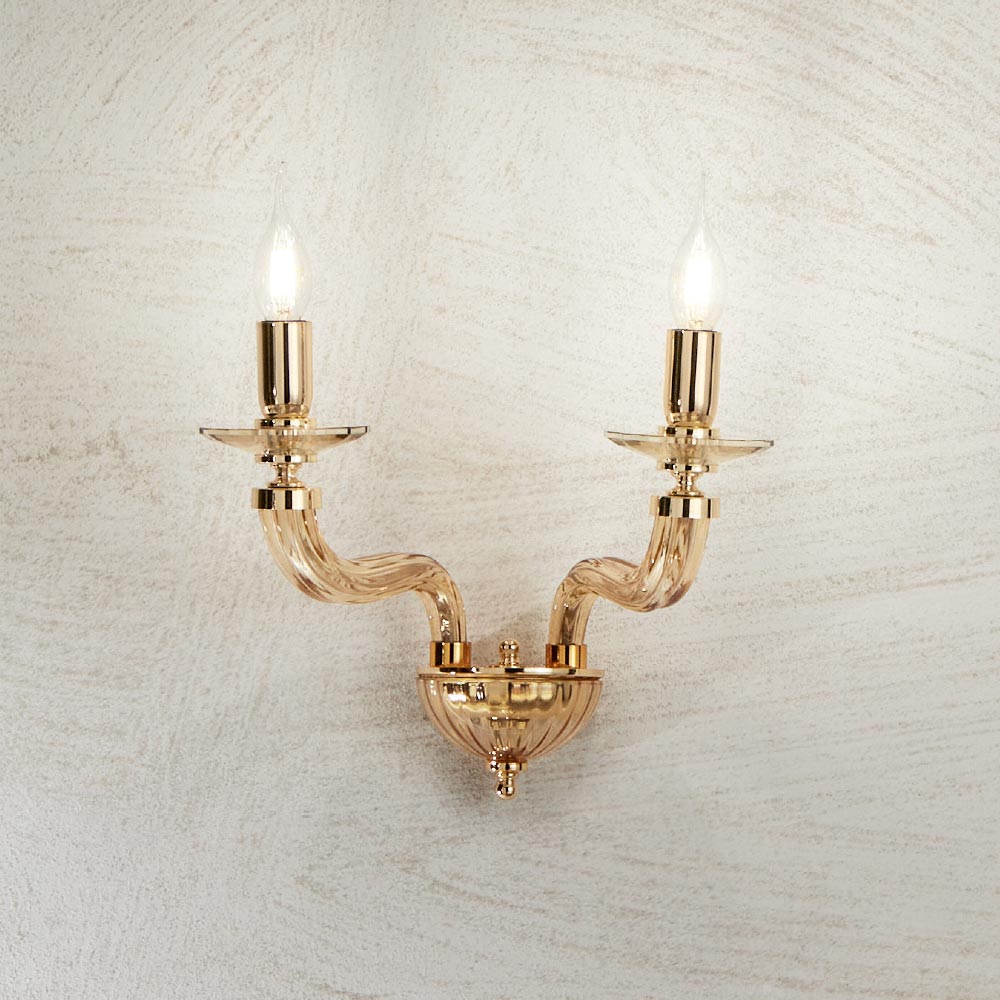 تتكون هذه الثريا الجدارية ذات الطراز الكلاسيكي من ذراعين منحنيين مصنوعين من الزجاج يدويًا في إيطاليا بتأثير "ريجاتون" باللون الكهرماني والتي تدعم الصحون التي تستضيف مصادر الضوء.