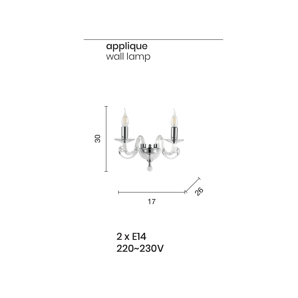 قادر على تحديد البيئة، يتكون هذا المصباح الحائطي من ذراعين مقوستين ترتكز عليهما اللوحات التي تحتوي على مصادر الضوء. مصنوع من زجاج مصنوع يدويًاوكريستال بصري بمواد عالية الجودةواهتمام خاص بالتفاصيل ، سيصبح ضوء الحائط بطل البيئة التي سيتم وضعه فيها، مزينًا بالكريستال البصري المستدير وتفاصيل معدنية مطلية بالكروم .