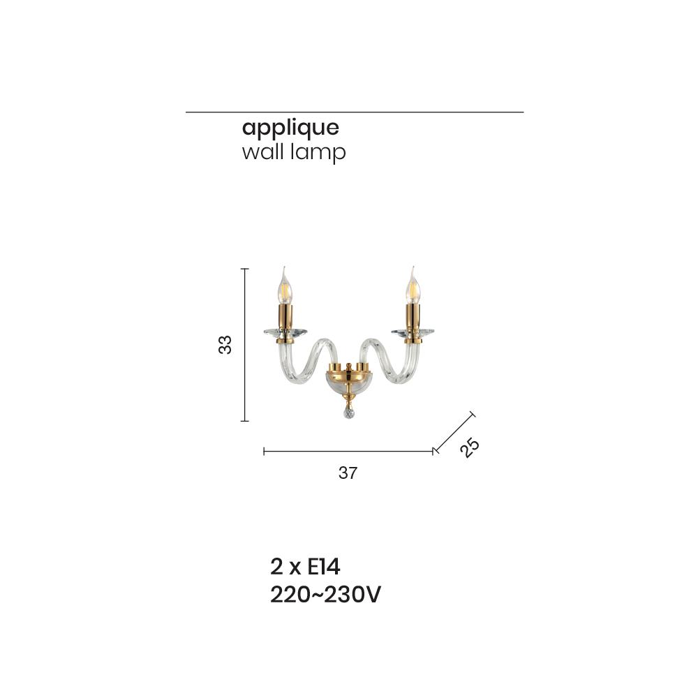 من الجودة العالية للمواد المستخدمة والاهتمام الخاص بالتفاصيل، يولد هذا المصباح الحائطي الفاخر بأسلوب كلاسيكي وخالد ، مصنوع بالكامل في إيطاليا. مصنوع من ذراعين مقوستين من الزجاج المصنوع يدويًا مع تفاصيل معدنية ، وتحتوي ألواح الكريستال المقطوعة على مصادر الضوء، كما تم تزيين الهيكل بقلادة كريستالية بصرية مستديرة . مظهرها الملكي المهيب يضفي على كل غرفة، من غرفة المعيشة إلى غرفة النوم ، جوًا راقيًا وأنيقًا.