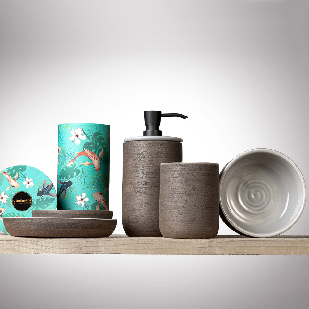 إكسسوارات حمام قائمة بذاتها مصنوعة من الطين الحراري والأتربة الداكنة ، مصنوعة يدويًا في إيطاليا ، مطلية بالمينا من الداخل بلمسة نهائية رمادية، لون يعكس الأناقة بأسلوب هادئ وبسيط. يتميز كل عنصر من عناصر التركيبة بتفاصيل دقيقة، مثل وسادة النيوبرين على قاعدة الملحقات لضمان حماية أسطح الدعم، وموزع الصابون المعدني الأسود غير اللامع المزود بمضخة لضمان توزيع مثالي للصابون. تتميز إكسسوارات سطح العمل بالأناقة والجاذبية، وهي عملية للغاية مع انعكاسات فريدة تُضفي أجواءً مميزة.
