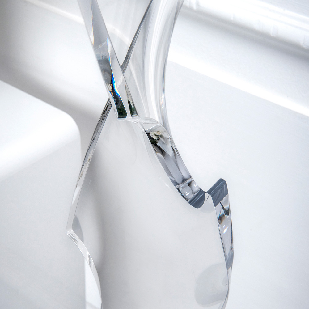 مصنوعة من قطعة واحدة من زجاج شبكي سميك، مقطوعة بدقة بالليزر ومُشكّلة حرارياً يدوياً ، تُعدّ شماعة المعاطف هذه دليلاً على براعة الصنع وتصميمها المبتكر . شكلها المتموج والانسيابي ليس مجرد متعة للنظر، بل هو أيضاً نقطة جذب تُضفي لمسة من الأناقة والتفرد على مدخل منزلك أو غرفة نومك أو مكتبك.