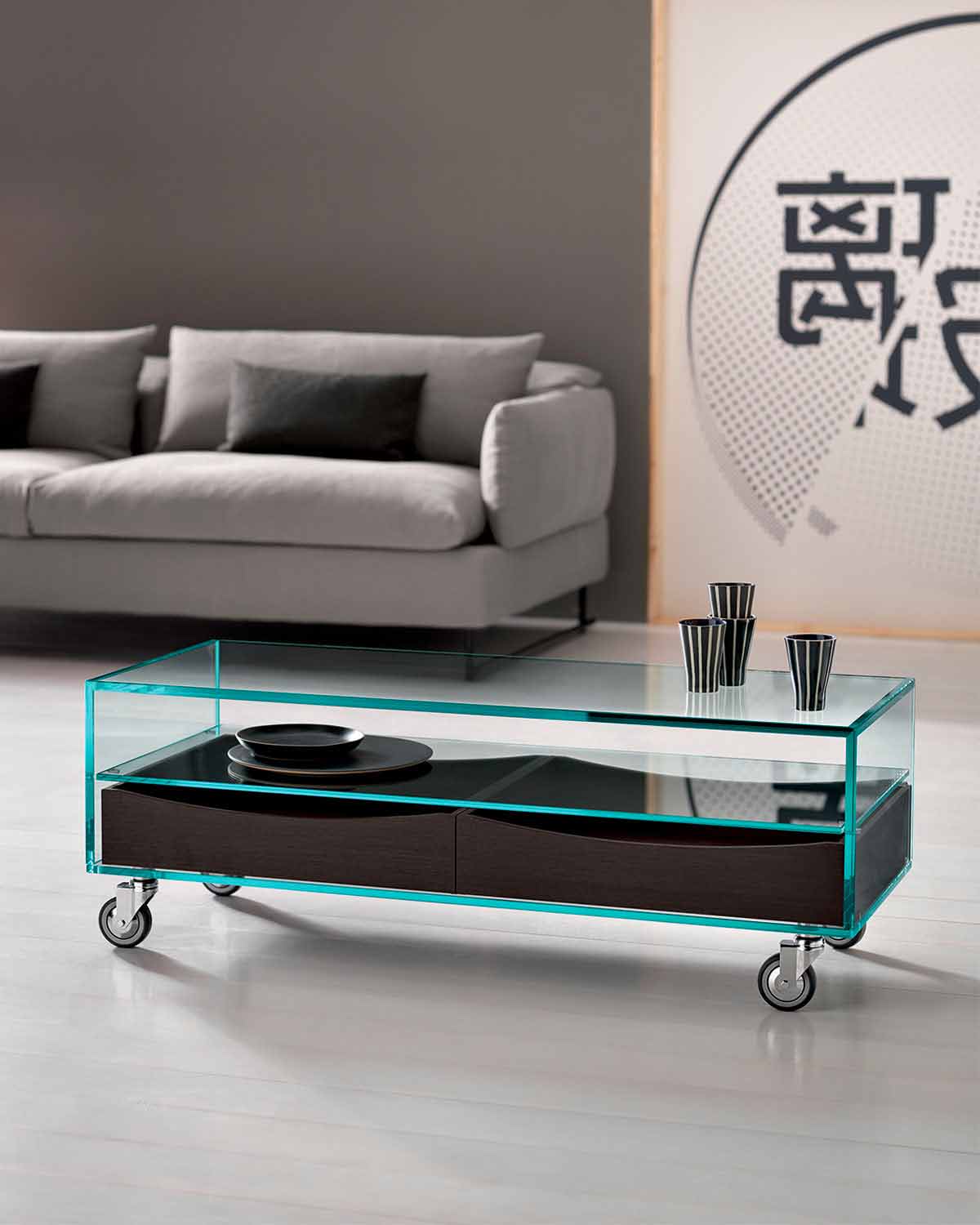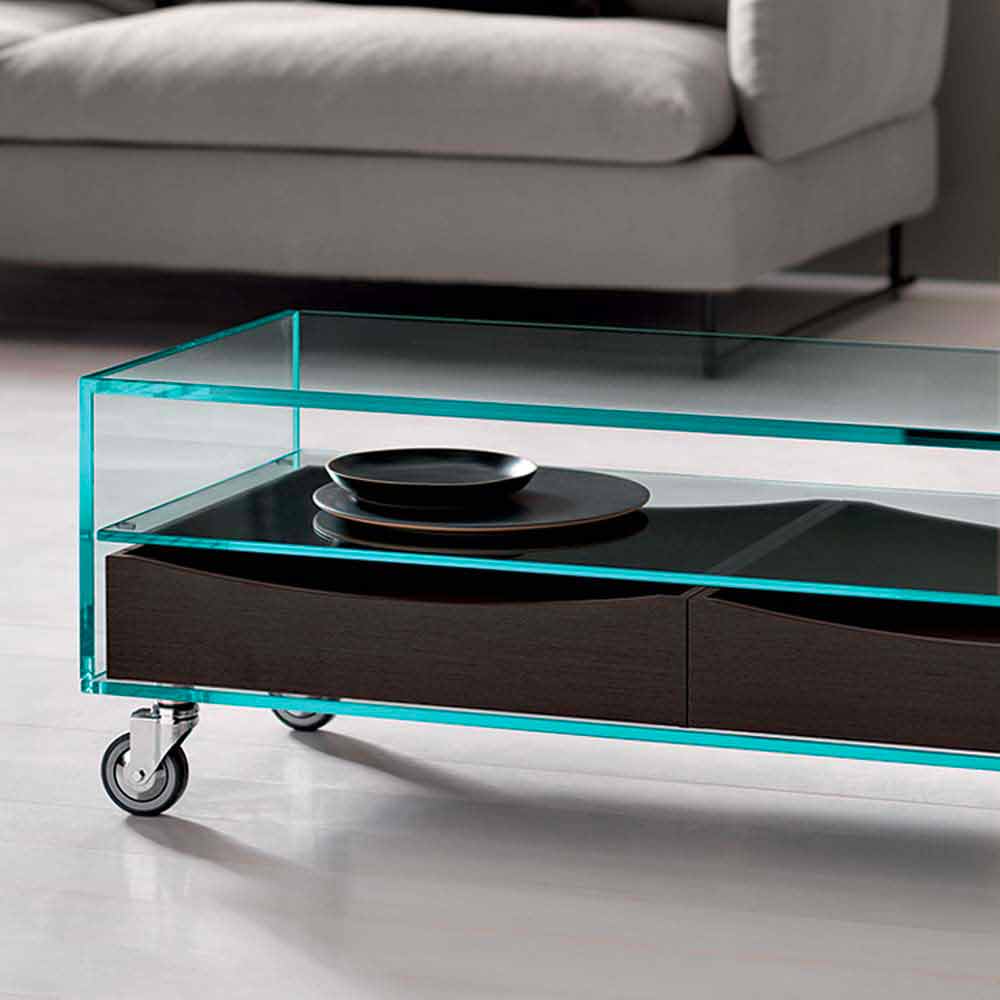 طاولة قهوة لغرفة المعيشة على الطراز الحديث على عجلات من الزجاج الشفاف للغاية مع درجين من خشب وينج، صنع في إيطاليا.