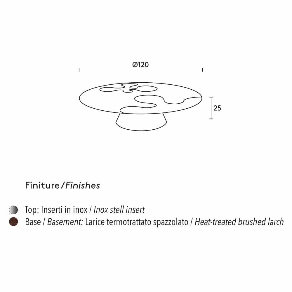 طاولة قهوة مصنوعة من خشب الصنوبر مع حشوات من الفولاذ المقاوم للصدأ Giglio، صنع في إيطاليا تتميز طاولة قهوة جيجليو بتصميم عصري وأصيل. ساقها المركزية المخروطية مصنوعة من خشب الصنوبر المصقول المعالج حرارياً. سطحها مزين بإضافات وأجزاء سفلية من الفولاذ المقاوم للصدأ.