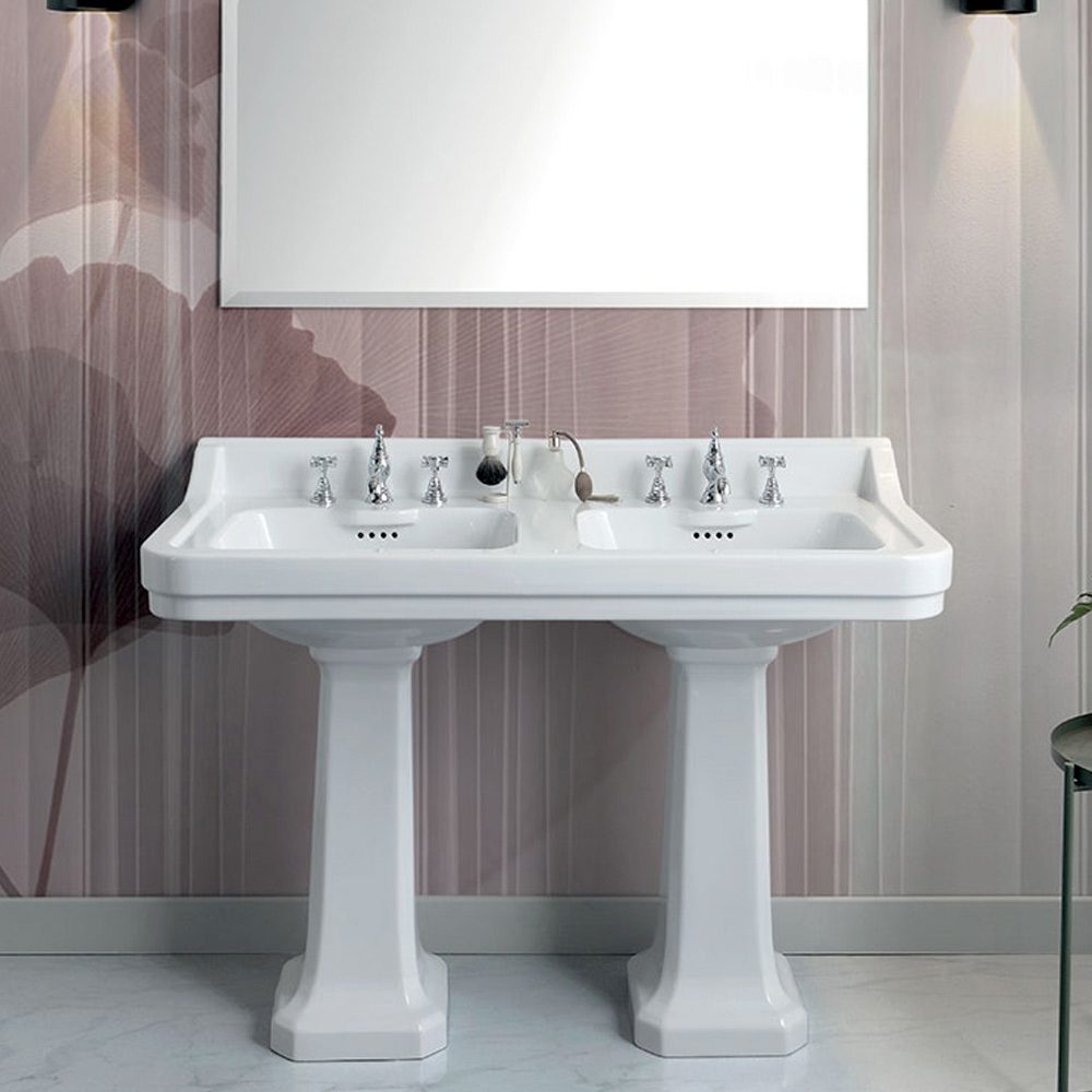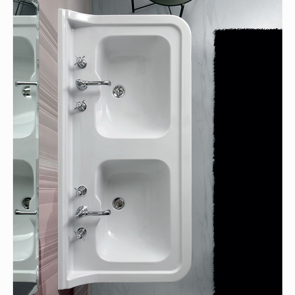 حوض غسيل مزدوج من كونسول مصنوع من السيراميك الأبيض اللامع، مصنوع يدويًا بالكامل في إيطاليا . قطعة أثاث تُضفي لمسةً من التصاميم الكلاسيكية القديمة، وتُضفي على حمامات كلاسيكية بطابعها الخاص، وفي الوقت نفسه، تُضفي لمسةً عصريةً تجمع بين الأصالة والتناقضات غير المسبوقة .