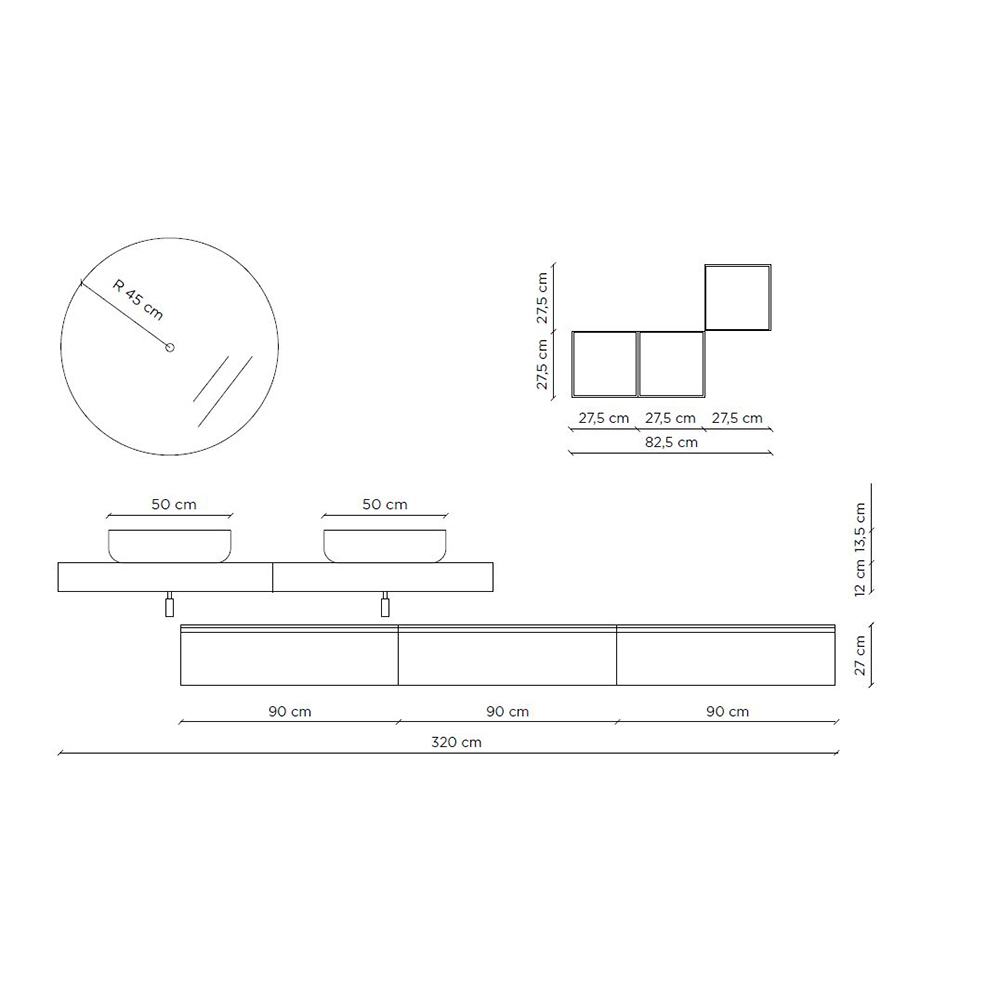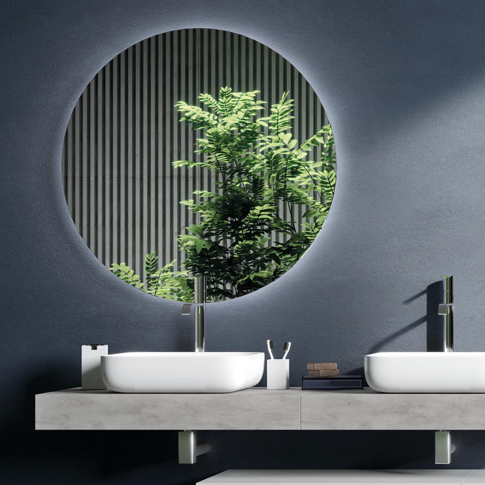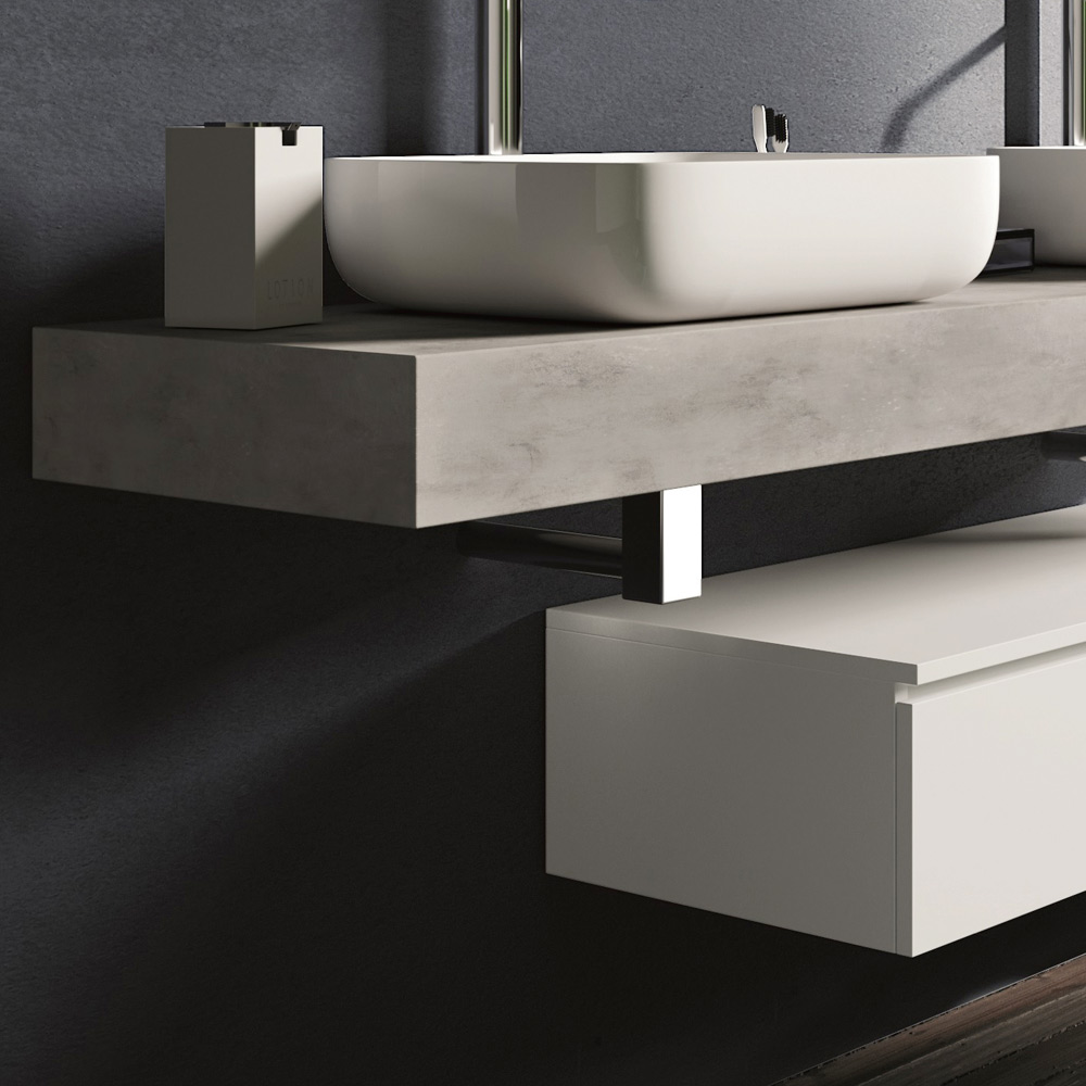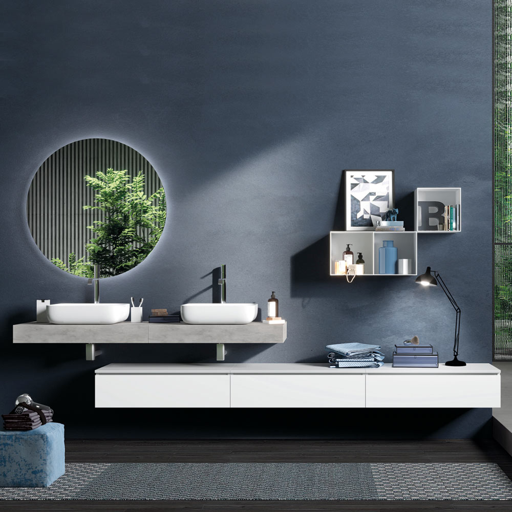 مجموعة حمام تتكون من: حوضين من السيراميك الأبيض اللامع مثبتين على سطحين متجاورين من خشب MDF مطلي وخشب HPL بلون الأسمنت ، وقاعدة مصنوع من مادة الميلامين المقاومة للخدش باللون الأبيض اللامع ومرآة دائرية مزودة بإضاءة LED محيطية.