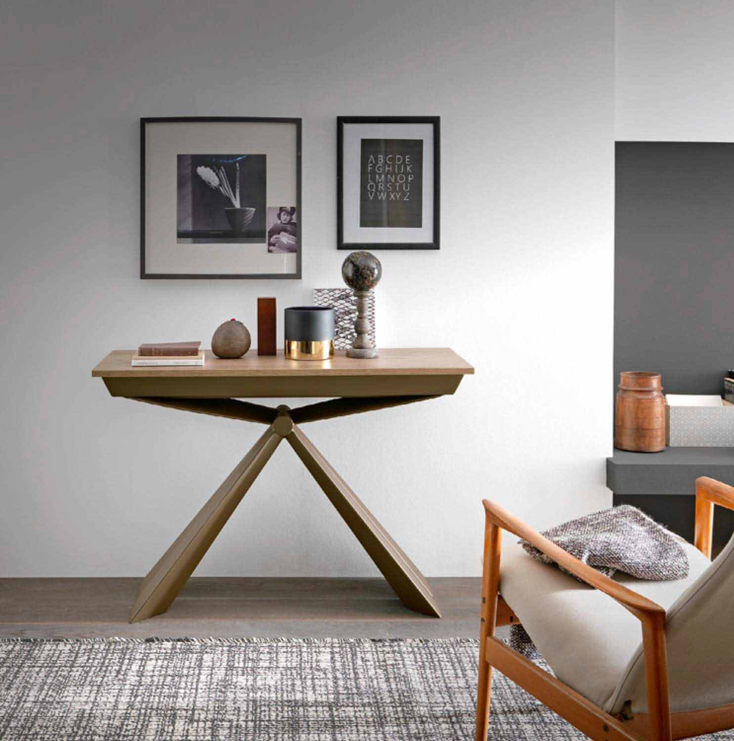ما يميزها هو إمكانية التحول من وحدة تحكم إلىطاولة طعام بفضل آلية التلسكوب المصنوعة من الألومنيوم. مصنوعة يدويًا في إيطاليا بمواد عالية الجودة ومصنوعة بنسبة 100% في إيطاليا. يتميز بوجود سطح قابل للتمدد مصنوع من خشب الميلامين وقاعدة معدنية .