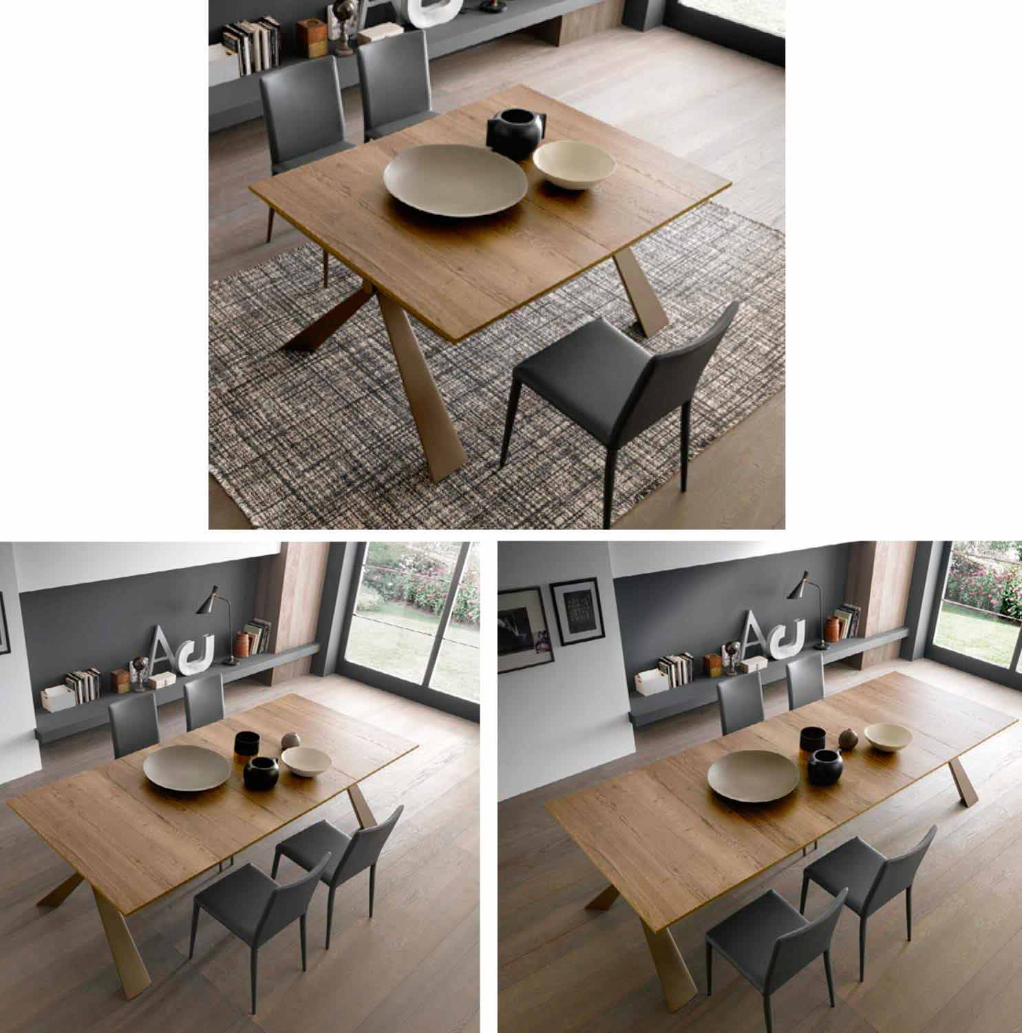 يتوفر الجزء العلوي القابل للتمديد بحد أقصى 3 أو 5 امتدادات يبلغ طول كل منها 50 سم، لاستيعاب من 4 إلى 8 ضيوف، بنفس تشطيب الجزء العلوي وبأرجل دعم مركزية.