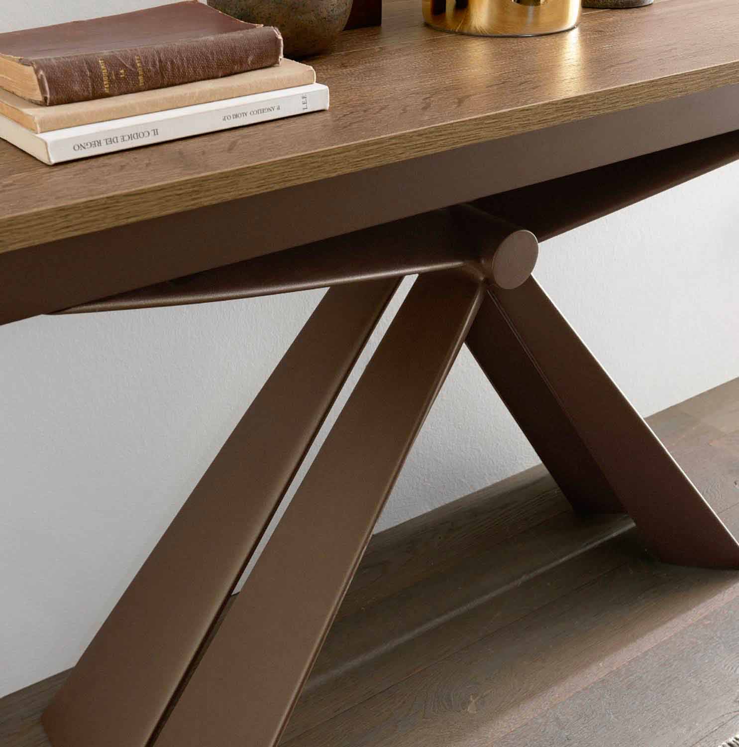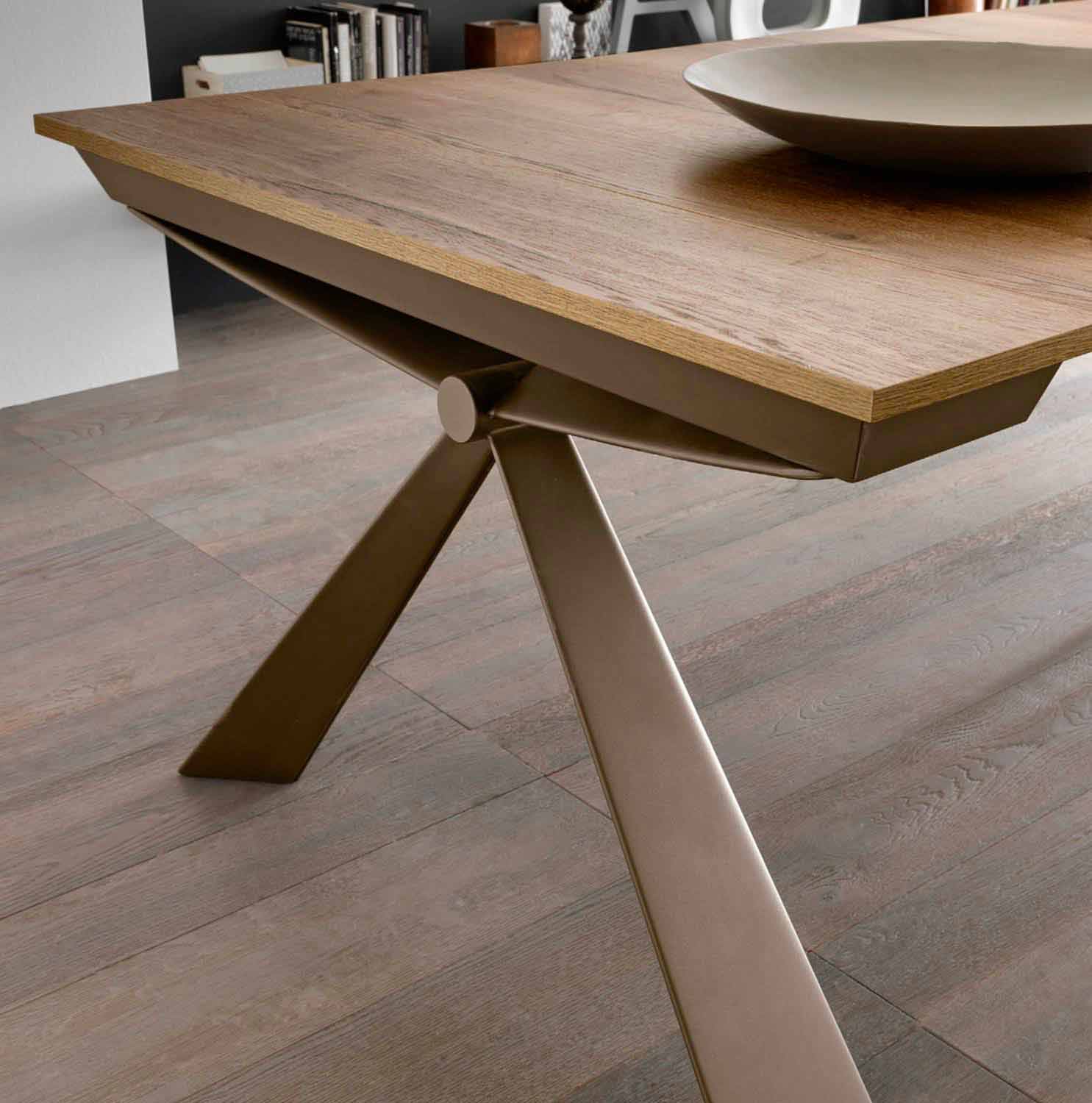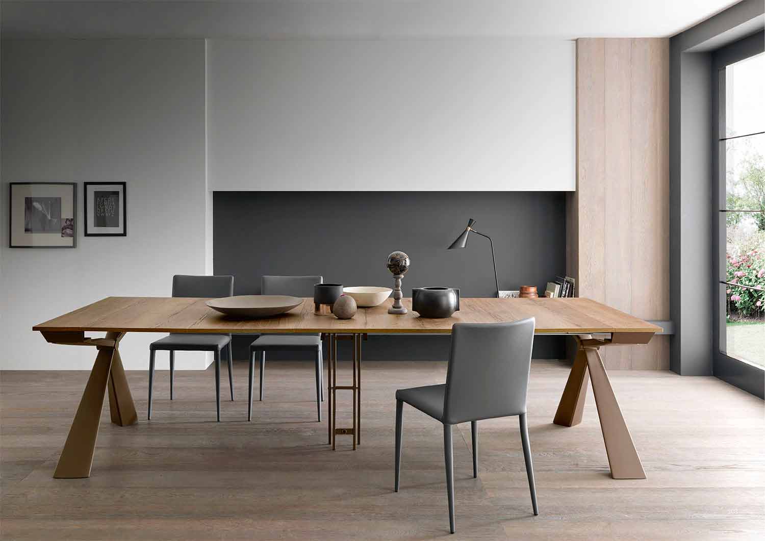 تتميز هذه الوحدة القابلة للتمديد بتصميم نحتي بفضل شكل الهيكل المعدني الذي تتقارب خطوطه في عقدة مركزية. النتيجة النهائية الأنيقة والمتناسقة للغاية تحتضن المساحة المحيطة بها في تأثير خلاب يحيط بها.
