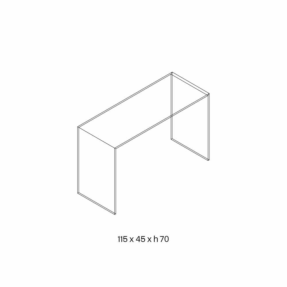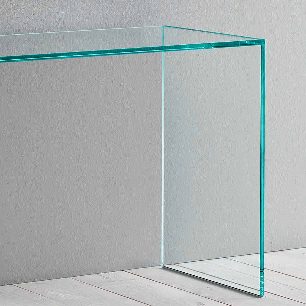 الكونسول هو قطعة أثاث يمكن استخدامها بشكل عرضي في سياقات مختلفة ولها هيكل جسر بسيط وخطي، مصنوع بالكامل من زجاج شفاف للغاية.