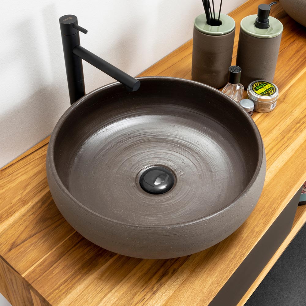 حوض غسيل دائري الشكل، مصنوع بالكامل في إيطاليا من الطين الحراري والتراب الداكن ، مصنوع يدويًا ومشوي على نار ثالثة. قطعة أثاث جذابة الملمس، متعرجة بأشكال ناعمة وأبعاد واسعة تجمع بين الأناقة والعملية ، مما يجعله مثاليًا لأي حمام. لمسته الريفية الأنيقة تُبرز طابعه المشرق ، مما يجعله عنصرًا أساسيًا في ديكور الحمام، ويضفي عليه لمسةً من الإشراق.