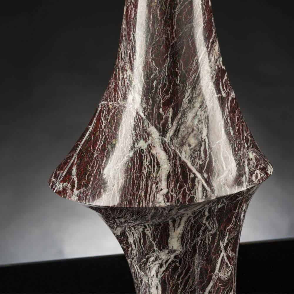 مزهرية أنيقة للديكورات الداخلية من رخام "أنتيكو دي إيطاليا" الأحمر، وهي مادة أرجوانية داكنة فاخرة ذات عروق بدرجات من الأخضر والأبيض ، مصنوعة في إيطاليا 100% . يتم إنتاجها من خلال معالجة الأحجار الطبيعية باستخدام بانتوغرافات خماسية المحاور، مما يسمح بالحصول على أشكال أكثر تعقيدًا من مجرد أحجام دوران بسيطة. تنبع هذه القطعة الأنيقة من الأثاث من الجمع بين دراسة الظواهر الطبيعية وتفاعل المواد المستخدمة مع التكنولوجيا البشرية، لإضفاء لمسة من الحيوية على أسلوب أثاث فريد وعصري. والنتيجة هي عنصر ديكوري فريد قادر على إثراء أي بيئة بجماليات عصرية وراقية ذات طابع مميز. إنه أسلوب مثالي لمختلف البيئات، من أثاث المنازل إلى الفنادق والمطاعم ومناطق التعاقد والمنتجعات الصحية، بالإضافة إلى أماكن إقامة الفعاليات وحفلات الزفاف.