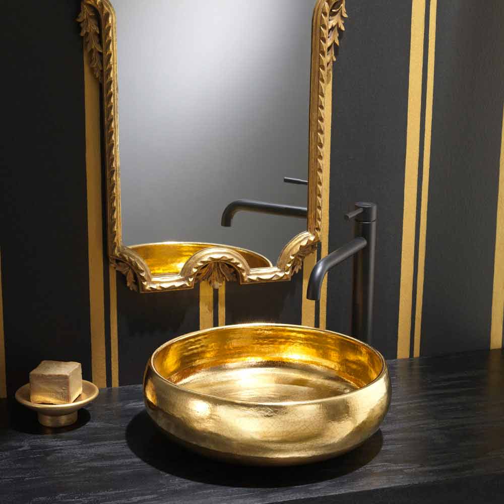 حوض غسيل الحمام مصنوع يدويًا في إيطاليا من السيراميك راكو مع لمسة نهائية من الذهب عيار 24 قيراط.