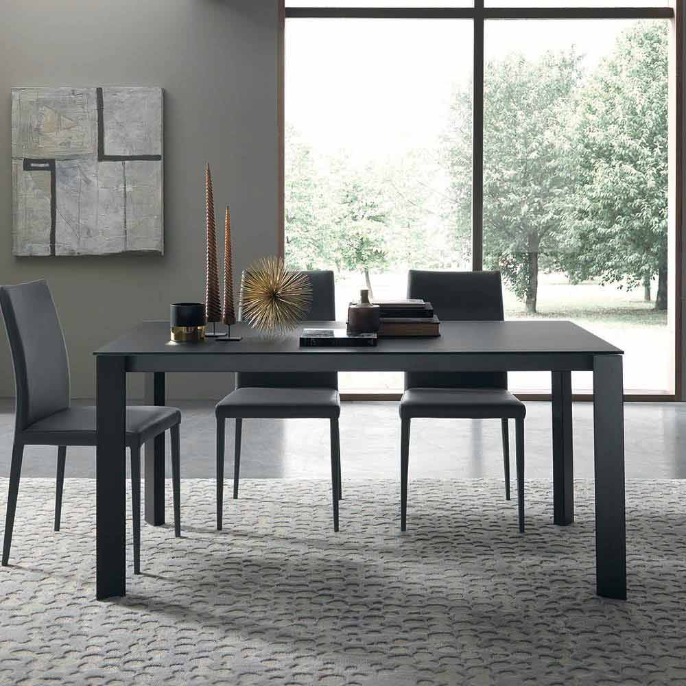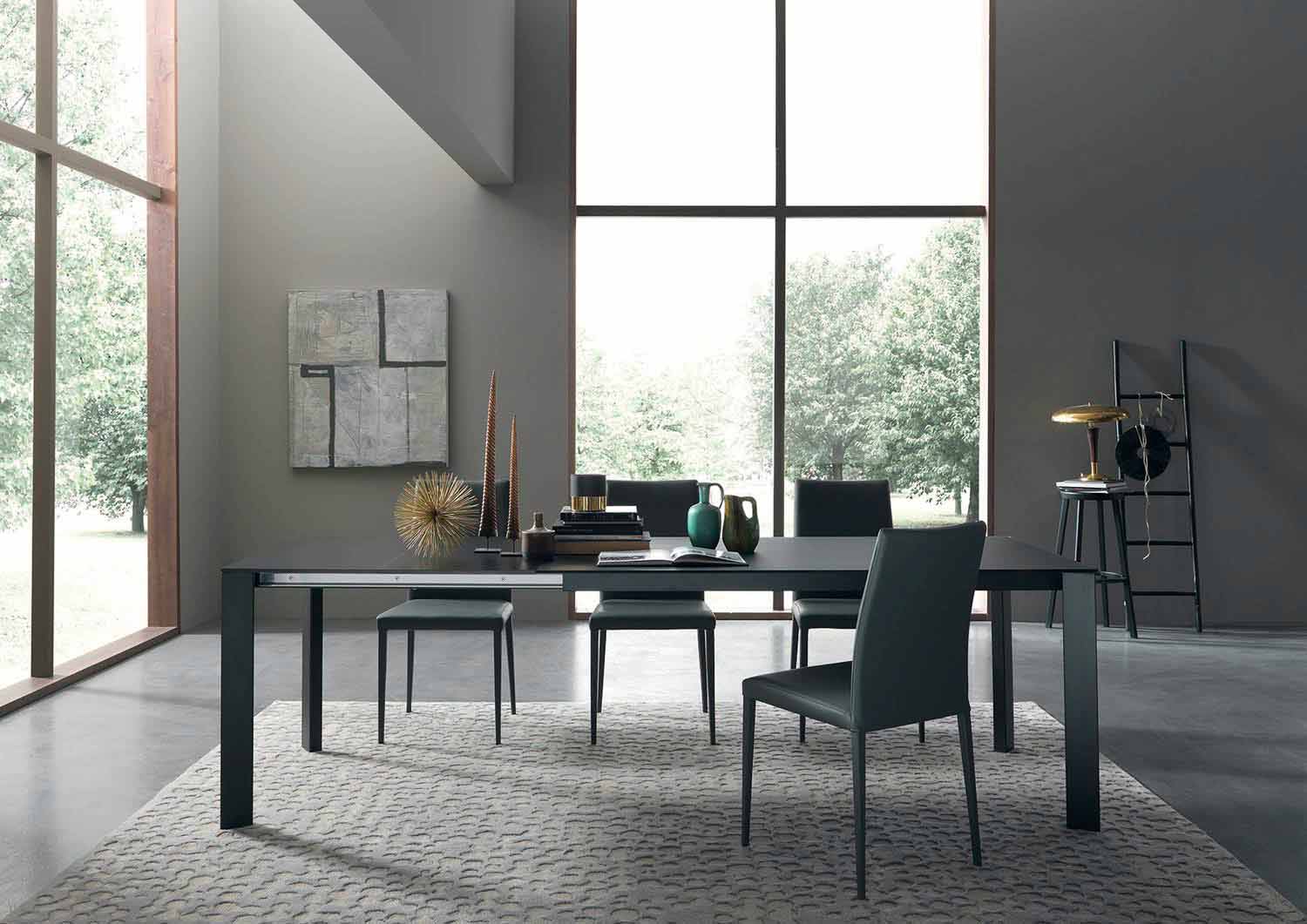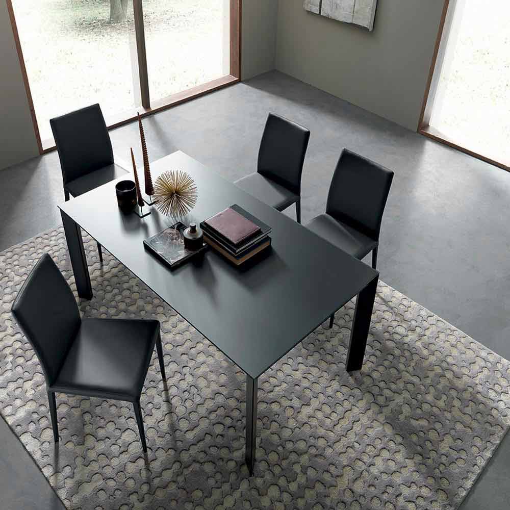 طاولة طعام حديثة قابلة للتمديد مع سطح زجاجي وأرجل معدنية صنع في إيطاليا.