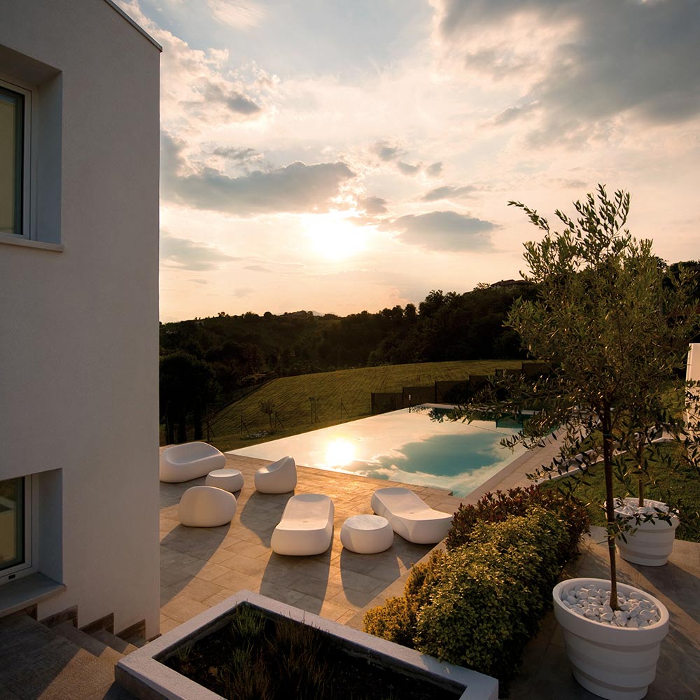 يتميز هذا الكرسي الخارجي بخطوط ناعمة وشكلٍ مُحيط، ما يجعله مزيجًا مثاليًا بين العملية والتصميم. مثالي لتزيين مختلف المساحات الخارجية بلمسة شخصية، وهو مصنوع بالكامل في إيطاليا باستخدام مواد خام مختارة بعناية لضمان منتج نهائي متين وعالي الجودة. هيكله مصنوع من البولي إيثيلين، ويتوفر بإصدار معتم يتميز بمقاومته الممتازة لأشعة الشمس والصدمات والحرارة، أو بإصدار مطلي مقاوم وبراقة يسمح لك بإنشاء انعكاسات ضوئية وانعكاسية تُضفي رونقًا خاصًا على المكان، أو بإصدار بتشطيبات خاصة أو بتشكيلة من آلاف الكرات الملونة التي تتألق على سطحه.