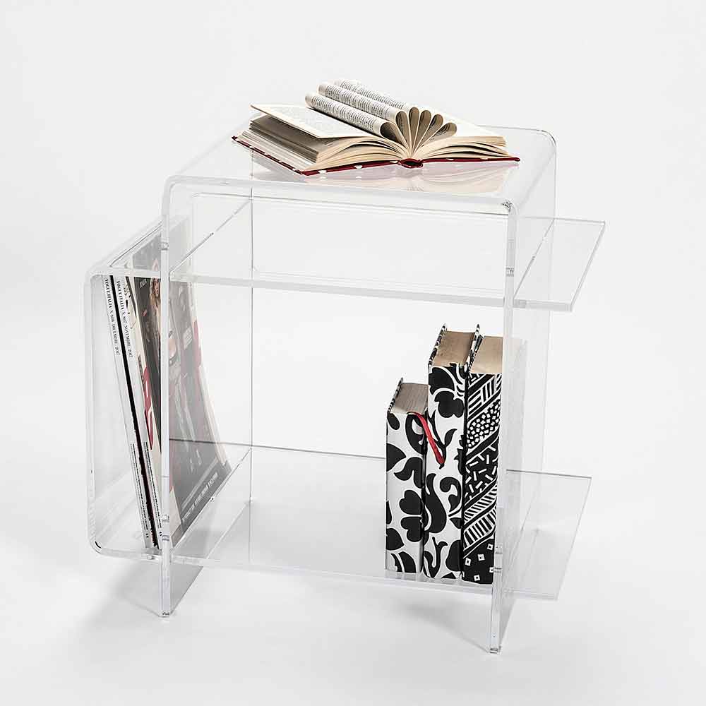 طاولة بتصميم من زجاج شبكي شفاف، صنع في إيطاليا، جوستو طاولة جانبية متعددة الاستخدامات بثلاثة رفوف / طاولة بجانب السرير، مستوحاة من هندسة السبعينيات، مصنوعة من زجاج شبكي شفاف 100% من البوليمر البكر، مقطوعة بالليزر ومطوية في درجات حرارة عالية.