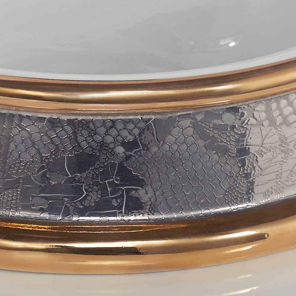 حوض غسيل نصف غائر بتصميم باروكي من الطين الناري، صنع في إيطاليا، مانيلو حوض حمام نصف غائر مصنوع في إيطاليا من طين النار المصنوع يدويًا مع شريط دانتيل من البلاتين وحلقات مطلية بالذهب عيار 24 قيراطًا.