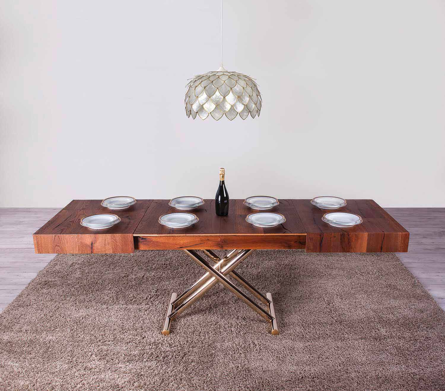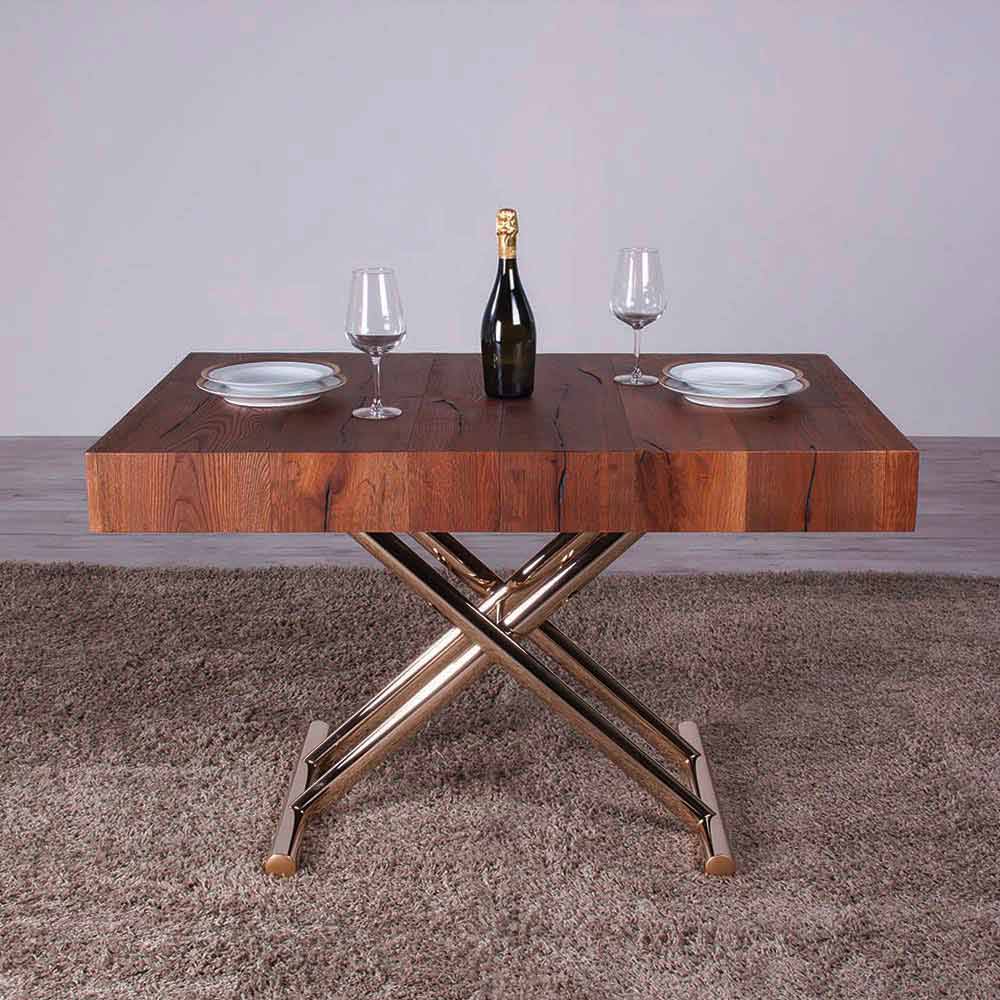 طاولة قهوة حديثة قابلة للتحويل إلى طاولة طعام ذات سطح خشبي وقاعدة معدنية صنع في إيطاليا.