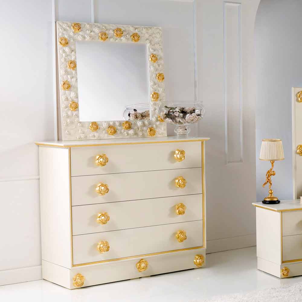 مرآة حائط بتصميم مزين بزهرة الورد تتميز مرآة "الزهرة" بحرفية عالية، مصنوعة من مواد عالية الجودة، بخبرة حرفيين إيطاليين مهرة. الإطار مصنوع من الخشب ومزخرف بورود. مطلية بطبقة ذهبية كريمية. مرآة كريستالية، سمكها 4 مم. صنعت في إيطاليا. يمكن تعليقها رأسيًا وأفقيًا. مُزود بخطافات للتثبيت على الحائط.