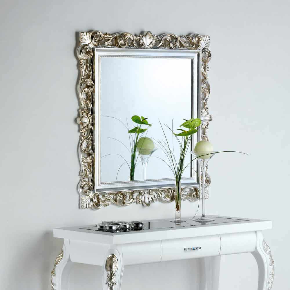 مرآة حائط بتصميم مع إطار مزخرف من مارسي، 98×98 سم تتميز مرآة مارسي بصناعة يدوية متقنة باستخدام مواد عالية الجودة وخبرة حرفيين إيطاليين مهرة. الإطار مصنوع من الخشب المزخرف بنقوش. مطلي بطبقة فضية. مرآة كريستالية، سمكها 4 مم. صنعت في إيطاليا.