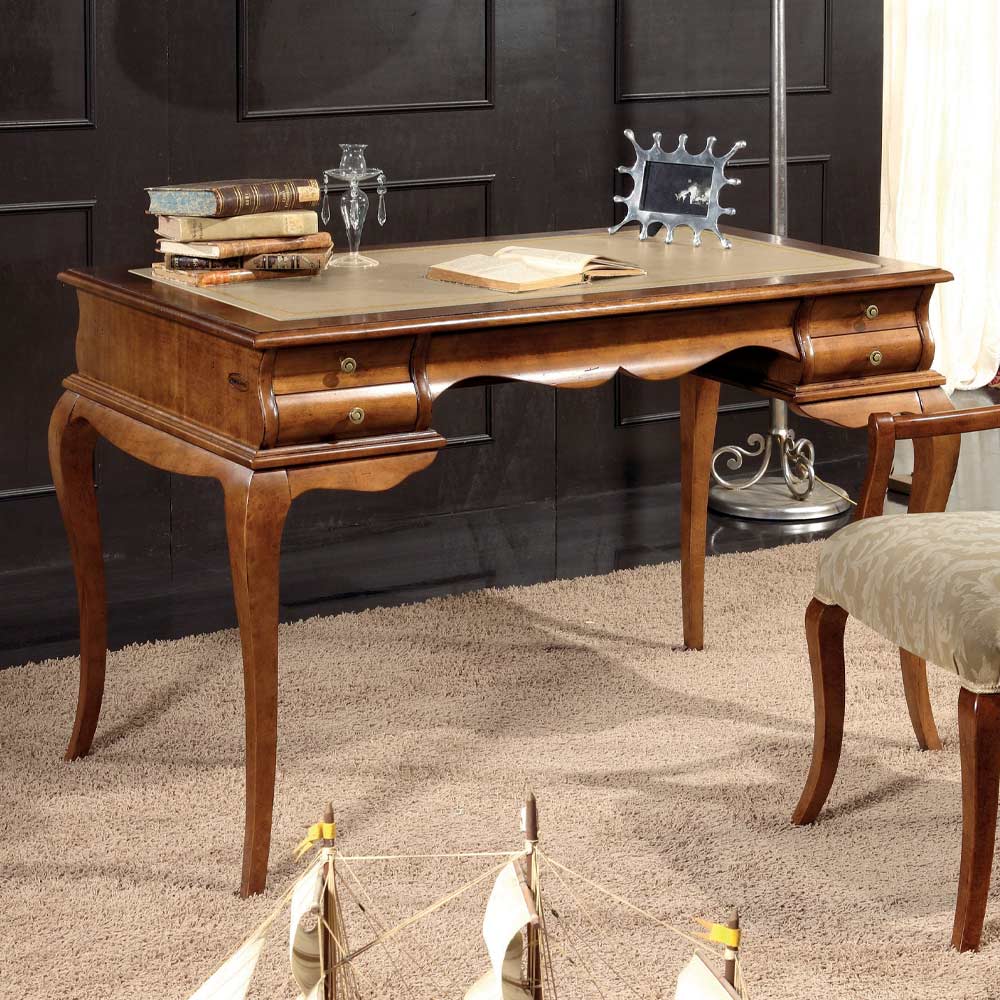مكتب فاخر بتصميم كلاسيكي، مزود بخمسة أدراج عملية مصنوعة من خشب الجوز مع بطانة من الجلد البيئي ، ومتوفرة بمقاسين. هذه القطعة العملية والأنيقة مصنوعة بالكامل في إيطاليا على يد حرفيين ماهرين ، بإتقان وذوق رفيع. يُصنع باستخدام أجود الخامات ، ويُنجز العمليدويًا بأقصى درجات العناية والاحترافية التي تميز المنتجات المصنوعة في إيطاليا .
