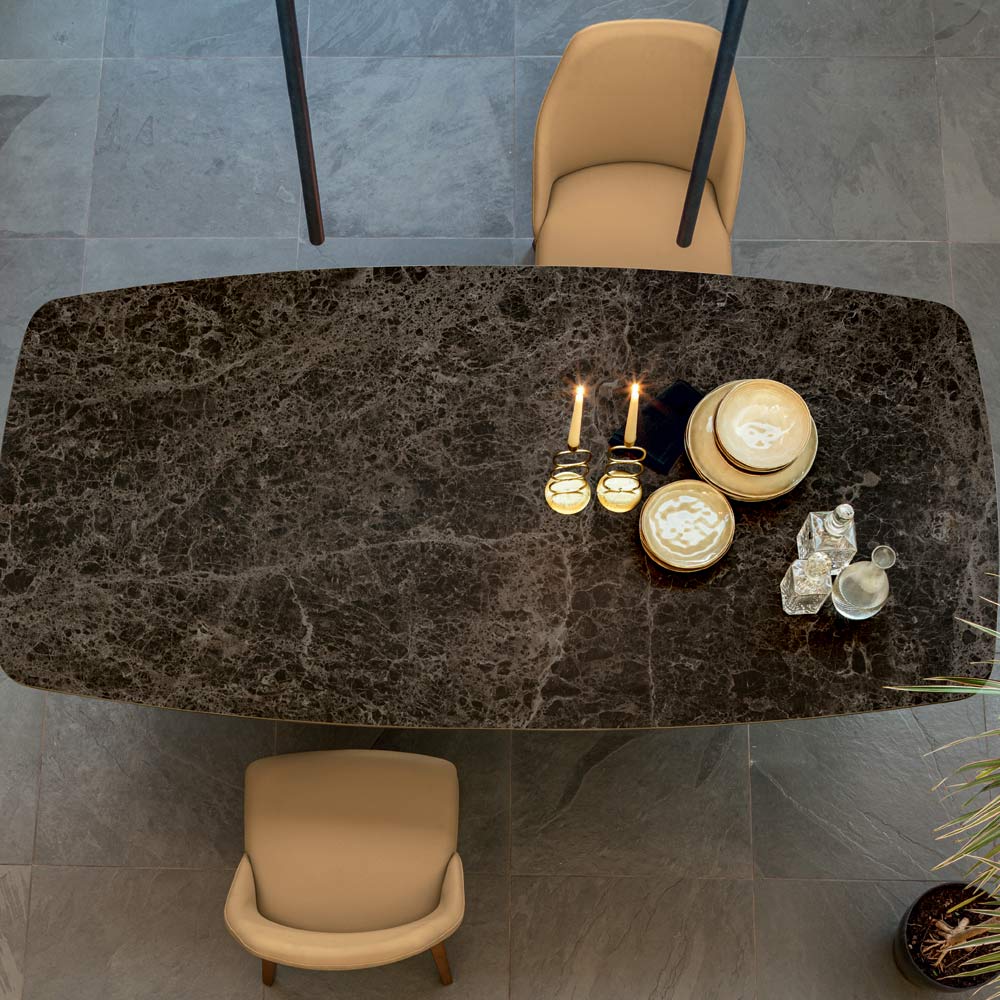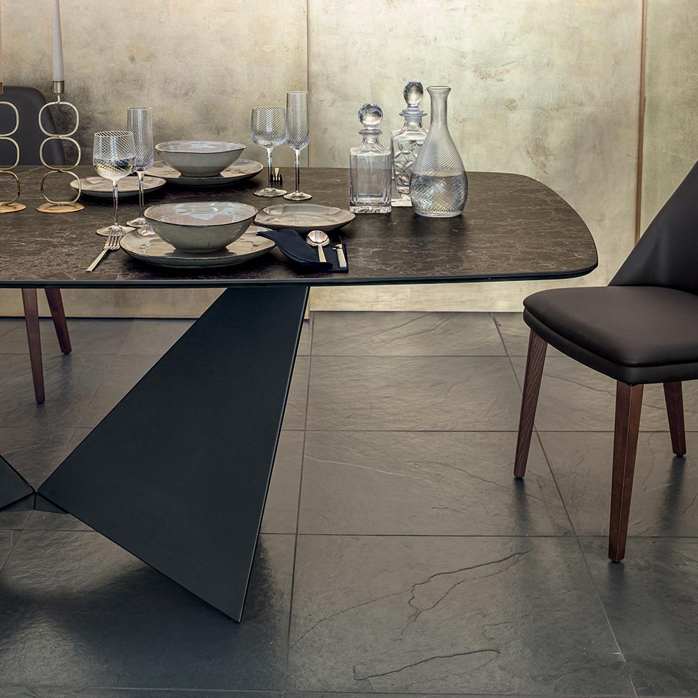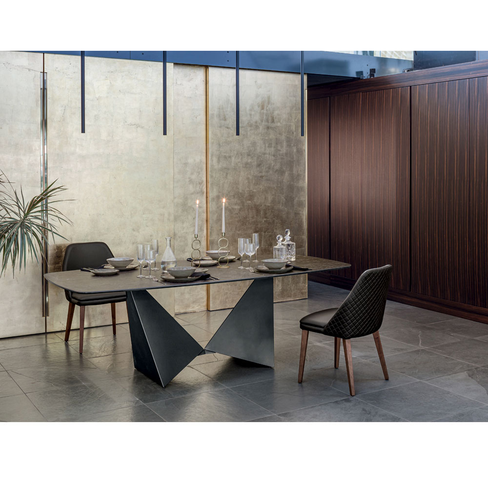 طاولة طعام بقاعدة معدنية وسطح سيراميك غير لامع بتشطيبات مختلفة مصنوعة في إيطاليا.
