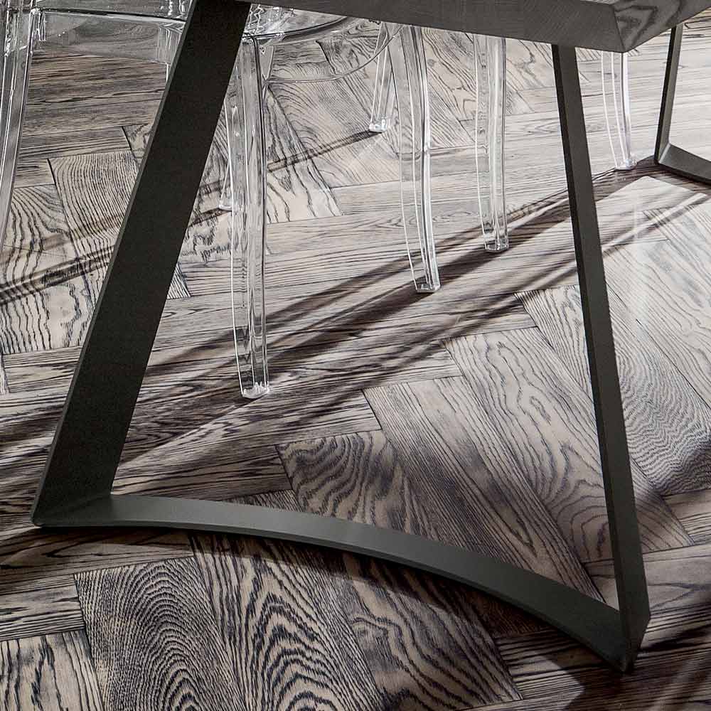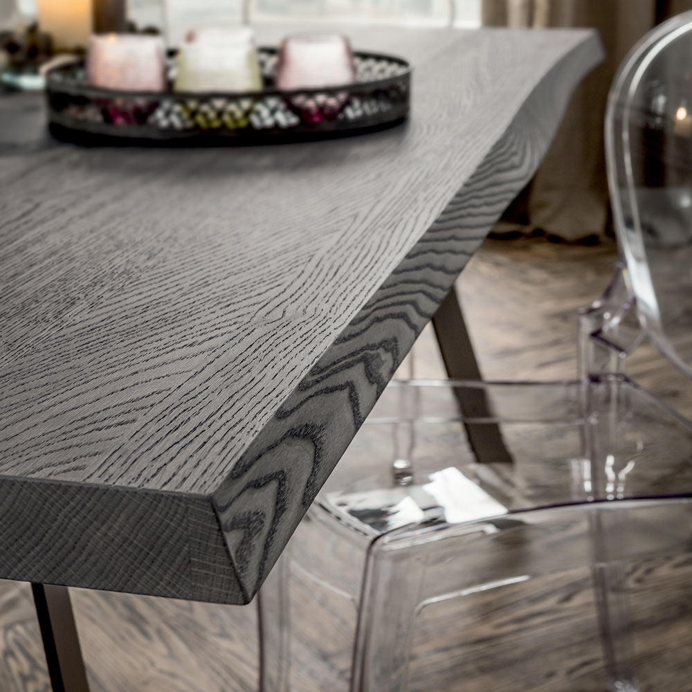 طاولة طعام مصنوعة في إيطاليا، سطحها من خشب البلوط المقشر، مصنوعة من لوح خشبي مكسو بقشرة بسمك 50 مم، وجوانبها من الخشب المصمت، وأرجلها معدنية مطلية بمساحيق إيبوكسي بلون لندن الرمادي. قطعة أثاث عصرية ورائدة، ترتكز في تصميمها على مفاهيم الجودة العالية والعملية ، دون إغفال الجانب الجمالي، وهو سمة أساسية عند اختيار طاولة الطعام المثالية. ما يميز هيكلها وتصميمها هو الشكل المميز للأرجل، الذي يمنحها طابعها العصري، ويثري جمالياتها بطريقة فريدة. علاوة على ذلك، تضفي الحافة غير التقليدية للسطح لمسة ريفية على النتيجة النهائية، مما يخلق تناغمًا رائعًا بين الأنماط والأشكال والخطوط لطاولة طعام ذات تأثير بصري قوي.