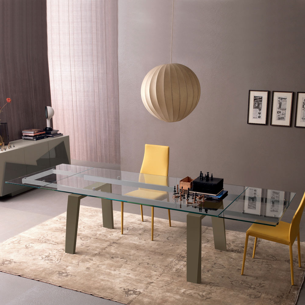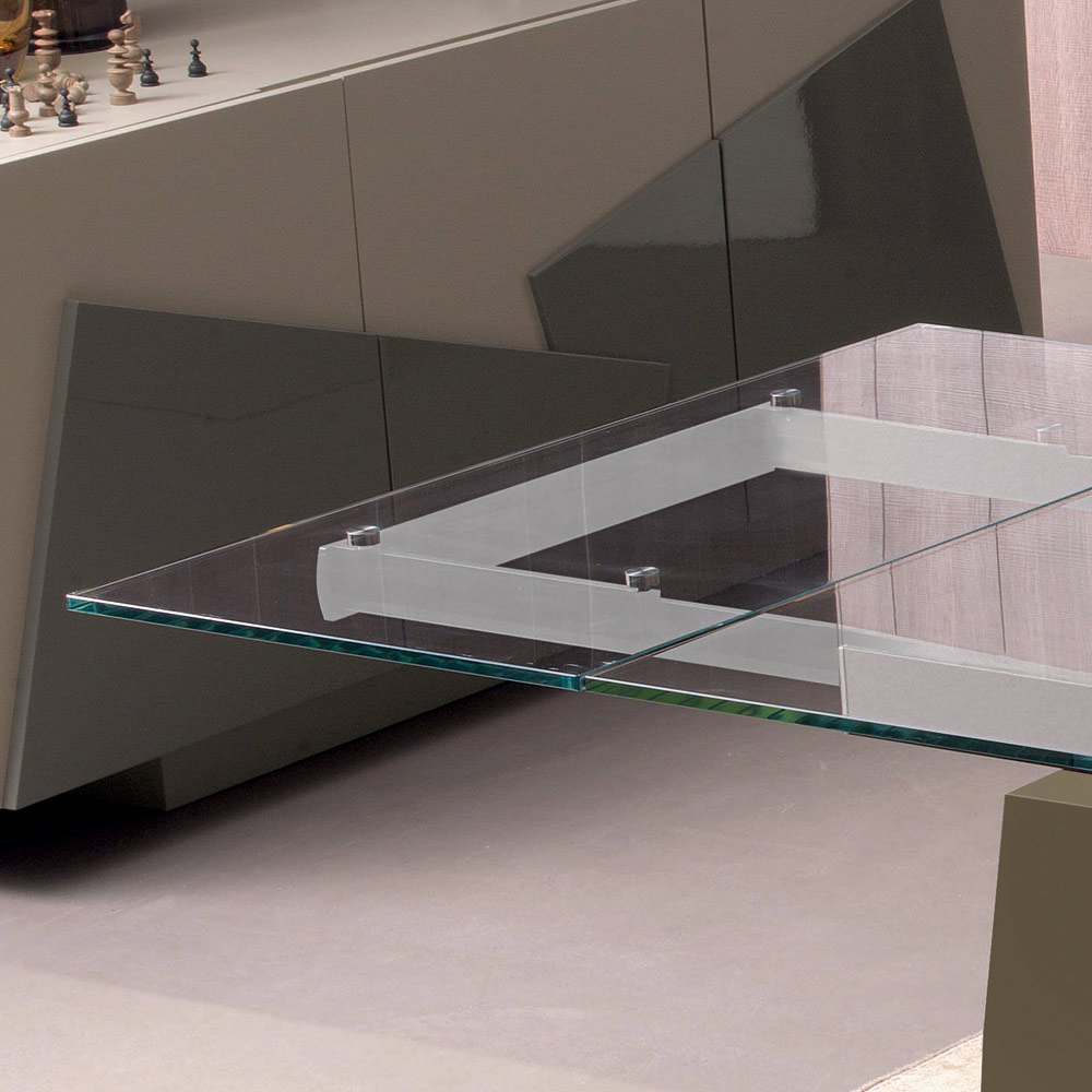 طاولة طعام قابلة للتمديد من الزجاج الشفاف وأرجل من الخشب المطلي، مقاسين صنعت في إيطاليا.