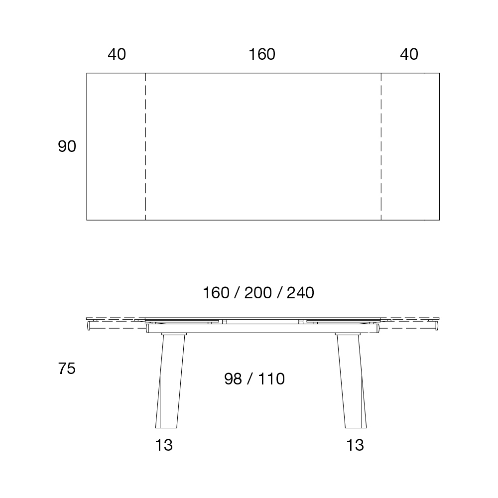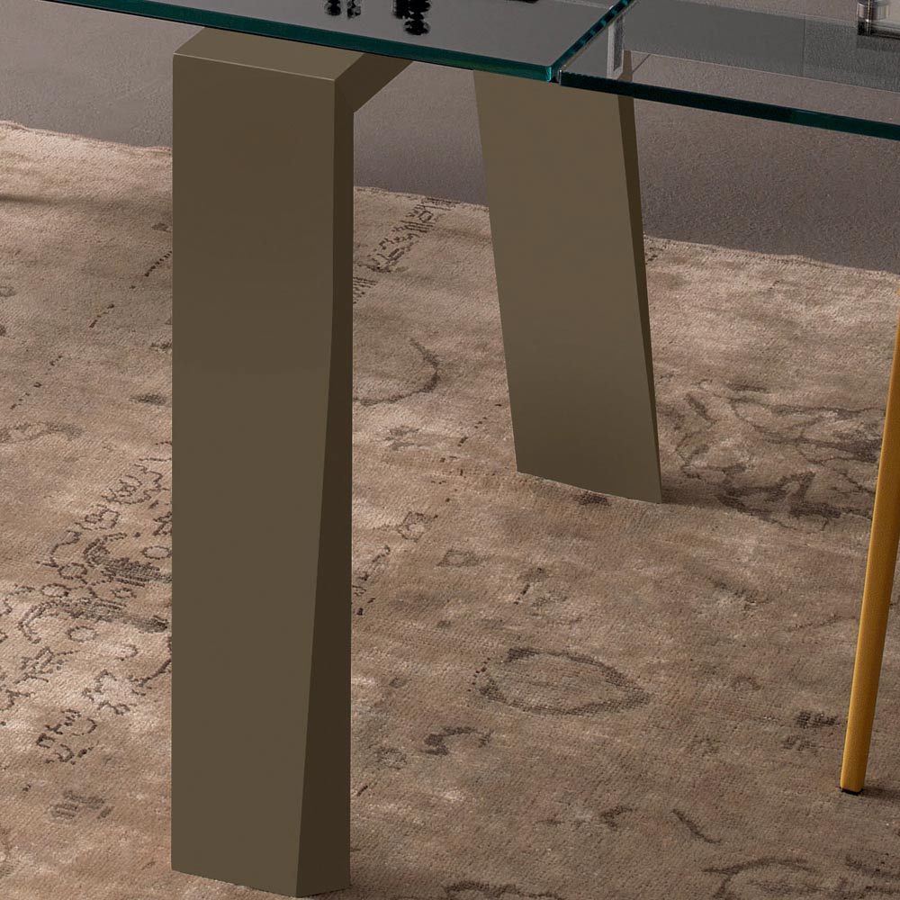 تتميز طاولة الطعام القابلة للتمديد هذه بهيكل مع أرجل من الخشب المطلي باللون البرونزي المعدني بتصميم شبه منحرف وجزء علوي من الزجاج الشفاف للغاية مع امتدادين وإطار من الألومنيوم قابل للتمديد. يضفي تصميمه العملي سطوعًا وخفة على بيئة الوجهة للحصول على أجواء مدهشة.
