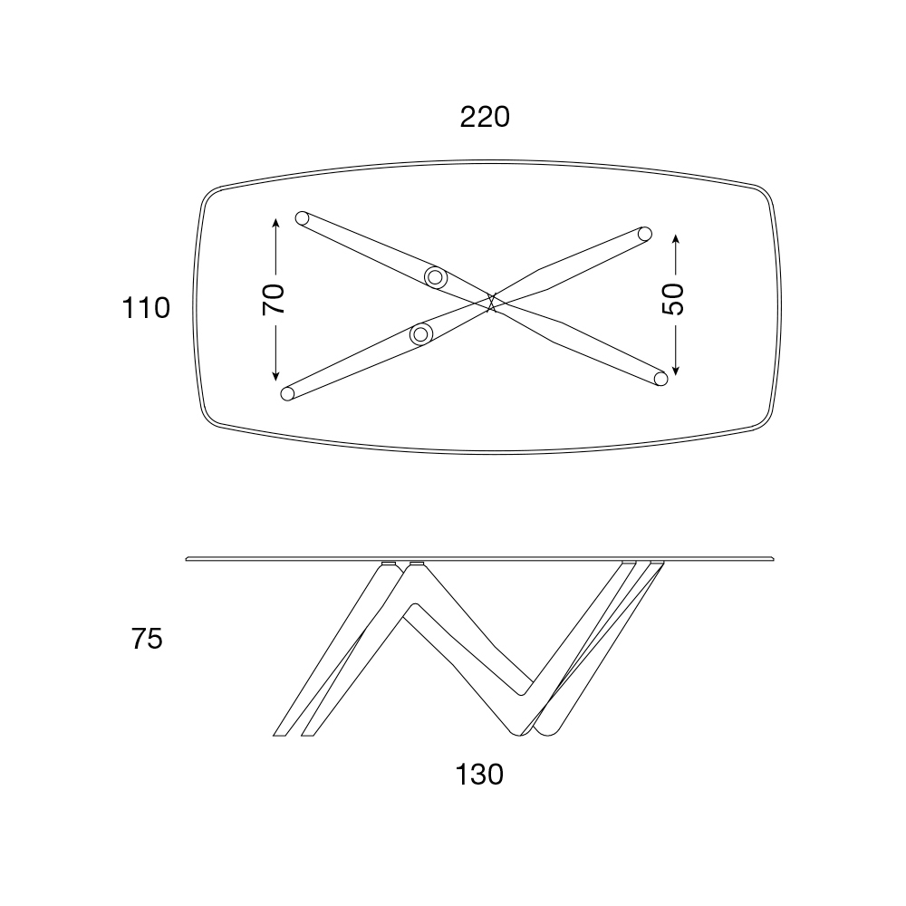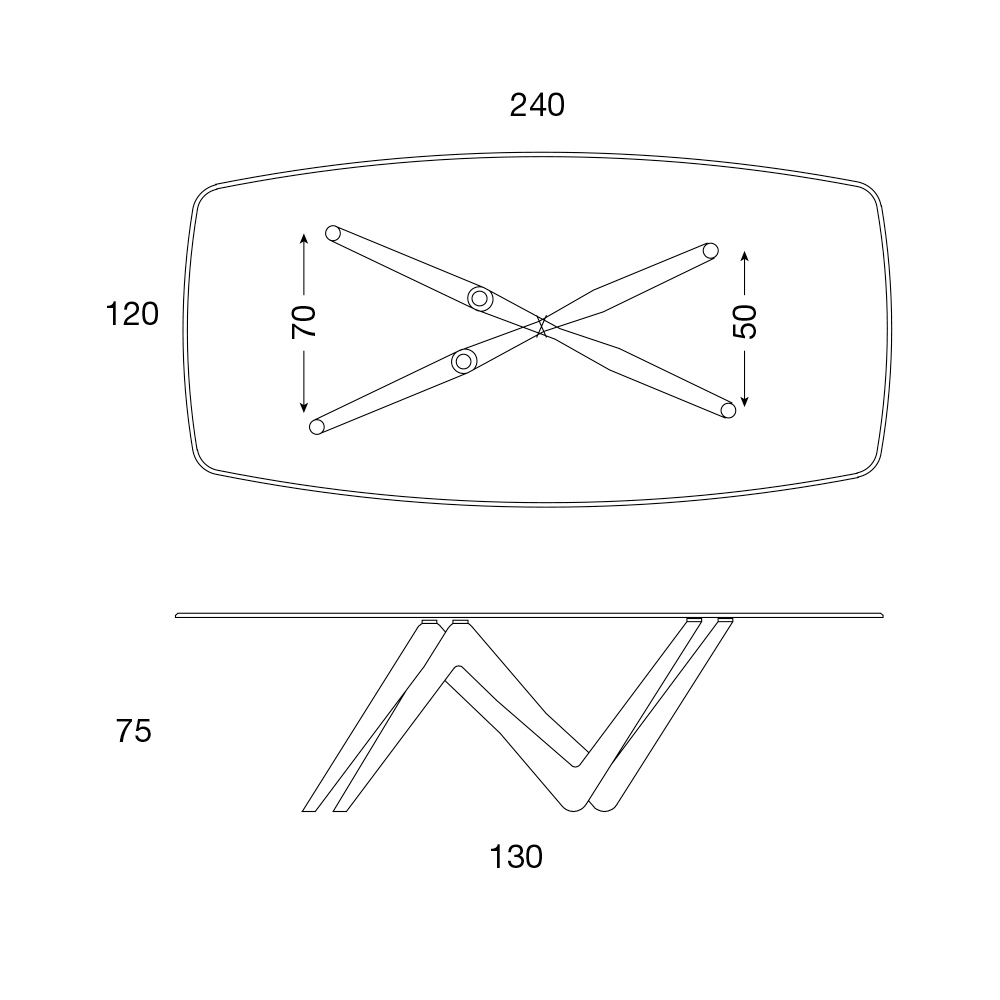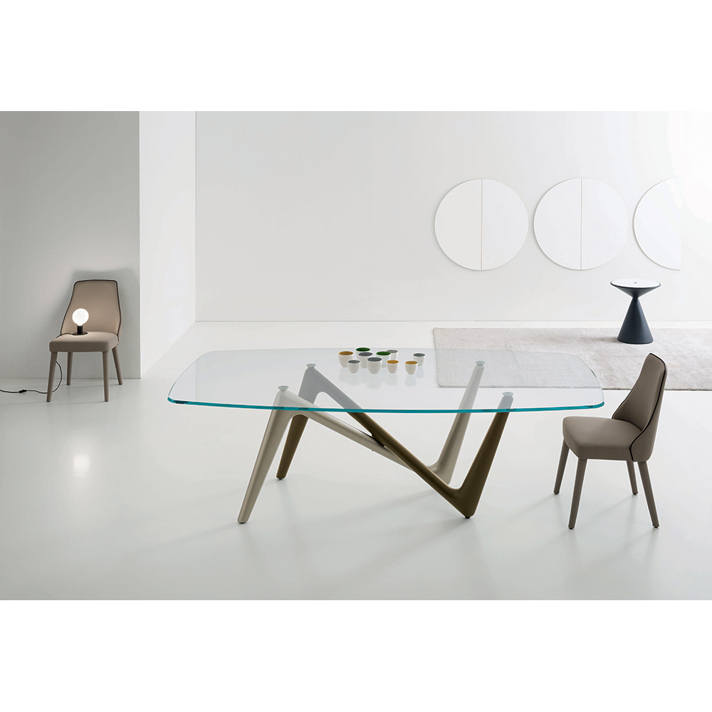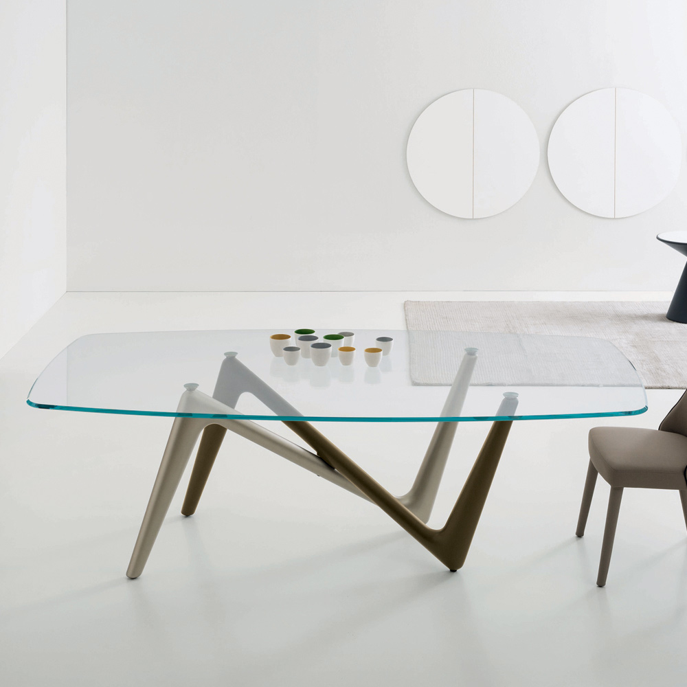 تتميز طاولة الطعام هذه بهيكل ذو أرجل من مادة البولي يوريثين الصلبة المطلية بالتيتانيوم والبرونز المعدني وجزء علوي على شكل برميل من الزجاج الشفاف للغاية مع حافة مشطوفة. تتميز هذه المنشأة بصورتها الديناميكية والمبتكرة من حيث الجمالية والوظيفة: حيث يتشابك الهيكل لدعم الجزء العلوي بشكل خفيف، مما يمنحها مظهرًا نحتيًا ومكررًا . تصميمها المتنوع والحصري مثالي للترحيب بالضيوف بأقصى درجات الراحة.