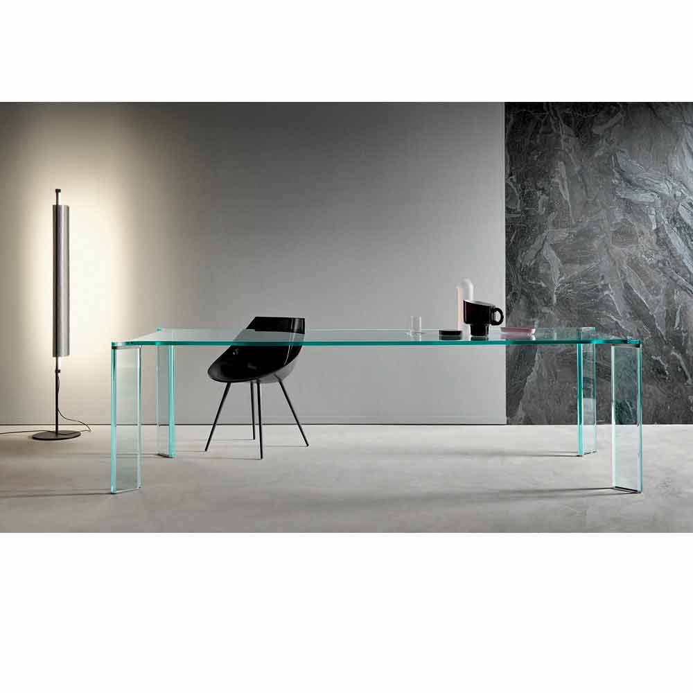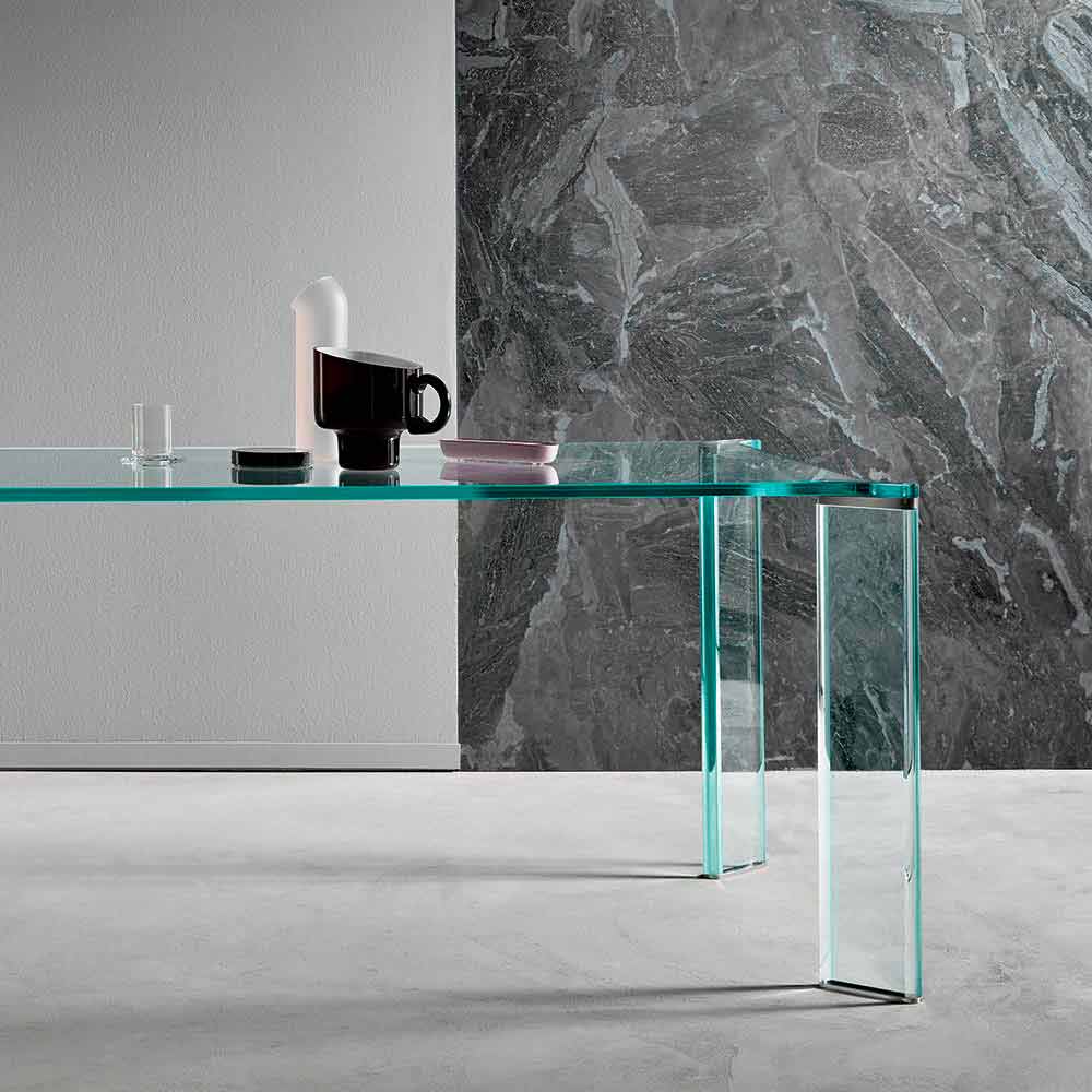 مصنوع من زجاج مغلف في الأعلى ، الأرجل مصنوعة من زجاج شفاف للغاية بسمك 40 مم مع لوحات طرفية لتوصيل الأرجل والأقدام من الفولاذ المقاوم للصدأ.