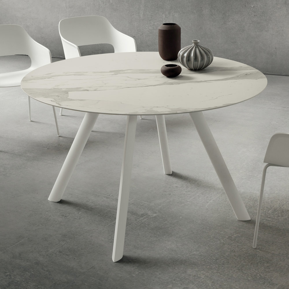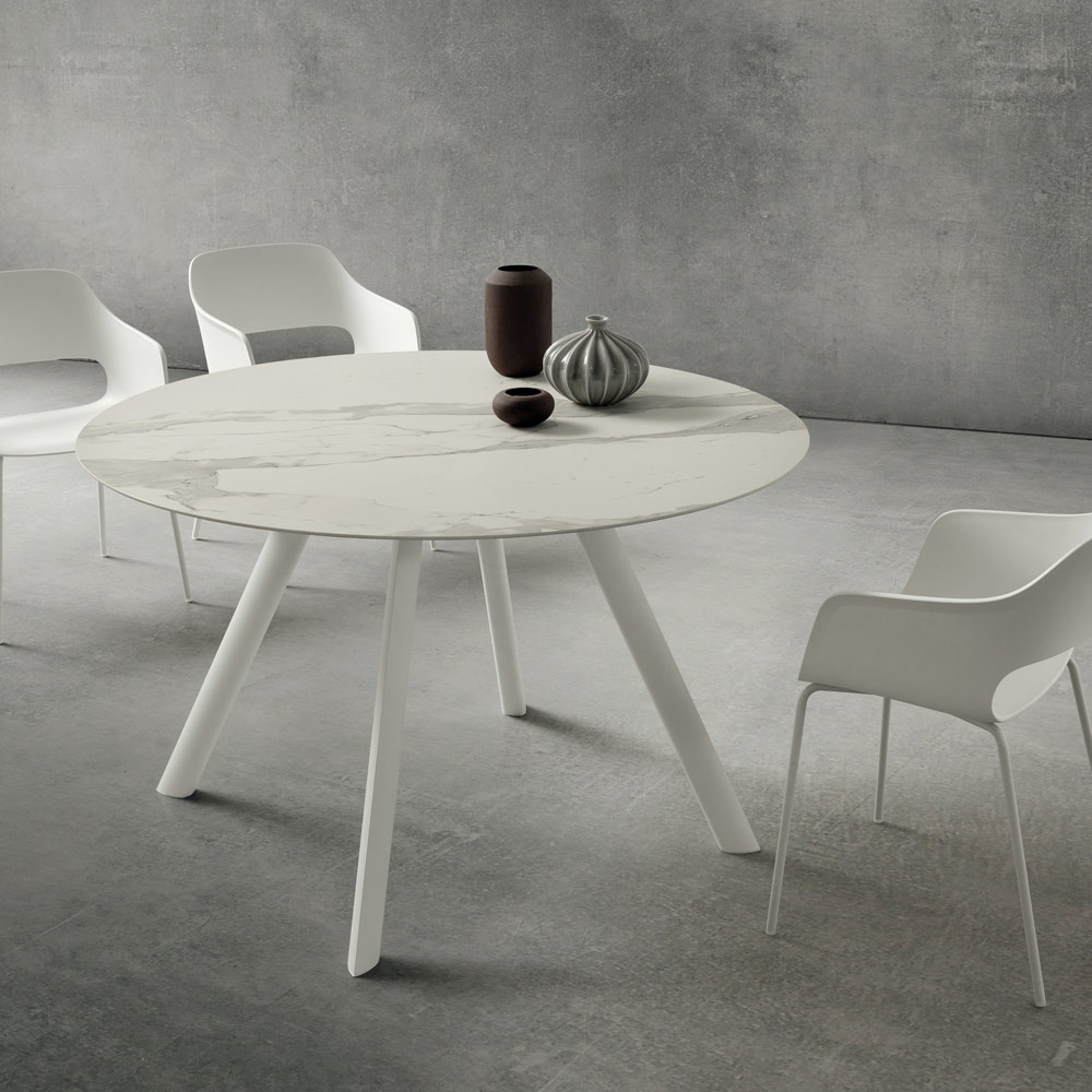 طاولة طعام فاخرة مع سطح دائري من السيراميك اللامائي صنع في إيطاليا.