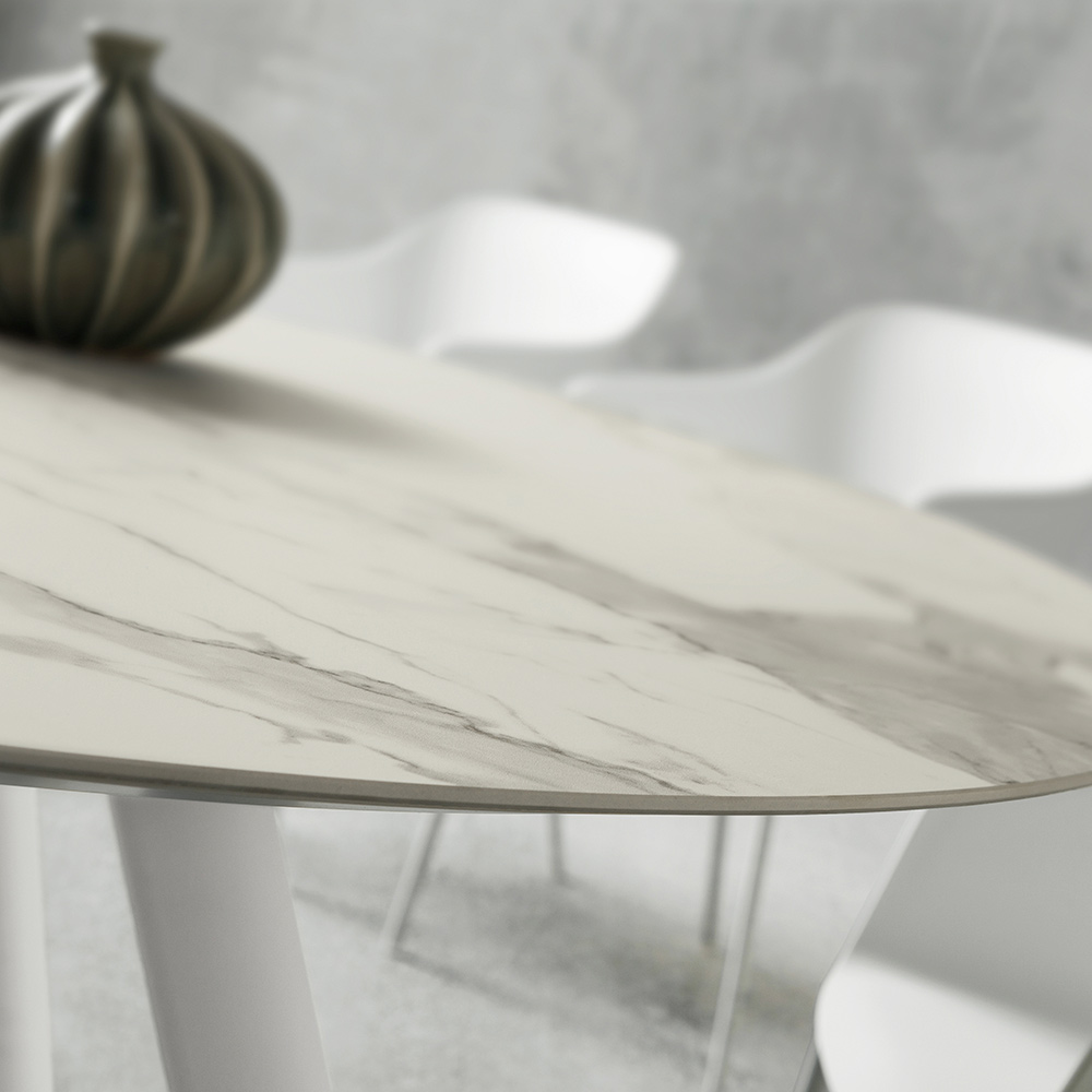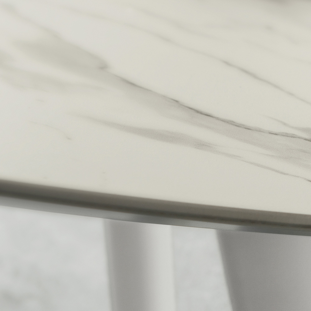 طاولة طعام مصنوعة في إيطاليا، بسطح دائري من اللامينام (الخزف الحجري) بسمك 6 مم، مع دعامة من لوح MDF ، وأرجل من الألومنيوم المطلي بمسحوق الإيبوكسي باللون الأبيض. من خلال التقاء الأناقة الخالدة لتأثير الرخام وتأثير الحجر مع لمسة الألومنيوم العصرية، وُلدت قطعة أثاث راقية بتصميم حصري ، قادرة على إضفاء لمسة مميزة على أي مساحة، بلمسة من أناقة السيراميك. تُثري القوام المميزة للسطح المتوفر جمالية المنتج النهائية، مما يُضفي لمسة فريدة من نوعها، تُلبي احتياجات أصحاب المساحات المحدودة الذين لا يرغبون في التخلي عن تصميم منازلهم بأناقة وشخصية مميزة . تتميز هذه الطاولة بجودة المواد المستخدمة وصنعها الإيطالي 100%، مما يزيد من قيمتها ومكانتها. ما يلفت الانتباه في جمال هذه الطاولة هو سطحها المصنوع من اللامينيم، وهو سطح سيراميكي مبتكر مصنوع من خليط من الخزف الحجري، مما يمنحها سطحًا مقاومًا للمذيبات والمطهرات والمنظفات، بالإضافة إلى الخدوش والتآكلات العميقة. كما أنها سهلة التنظيف وسريعة للغاية، مع الحفاظ على خصائصها المميزة.