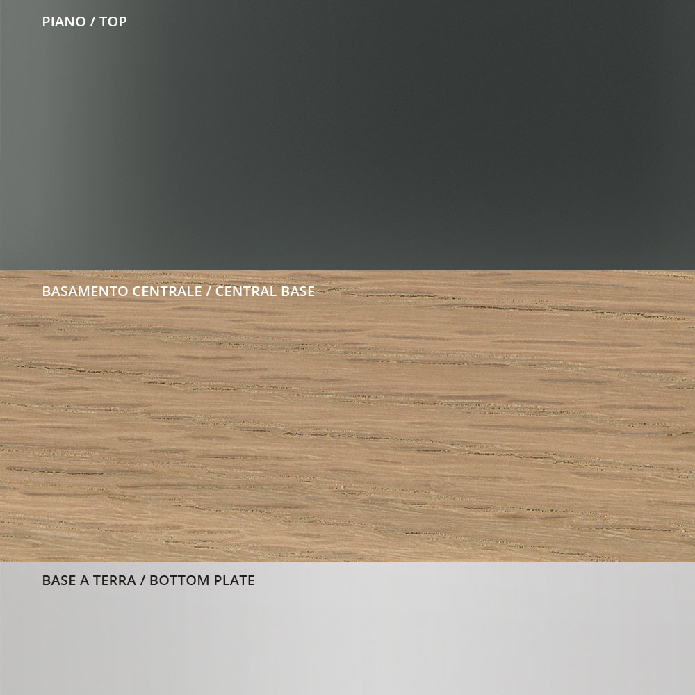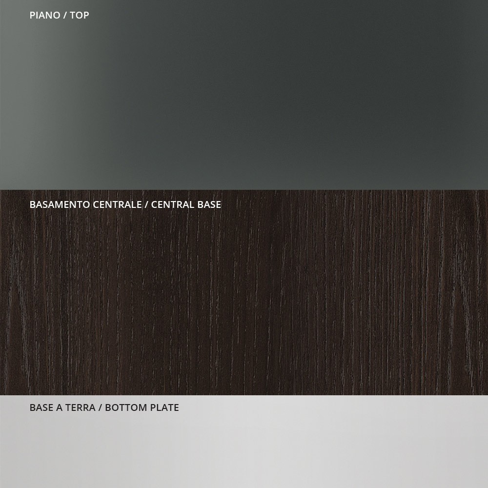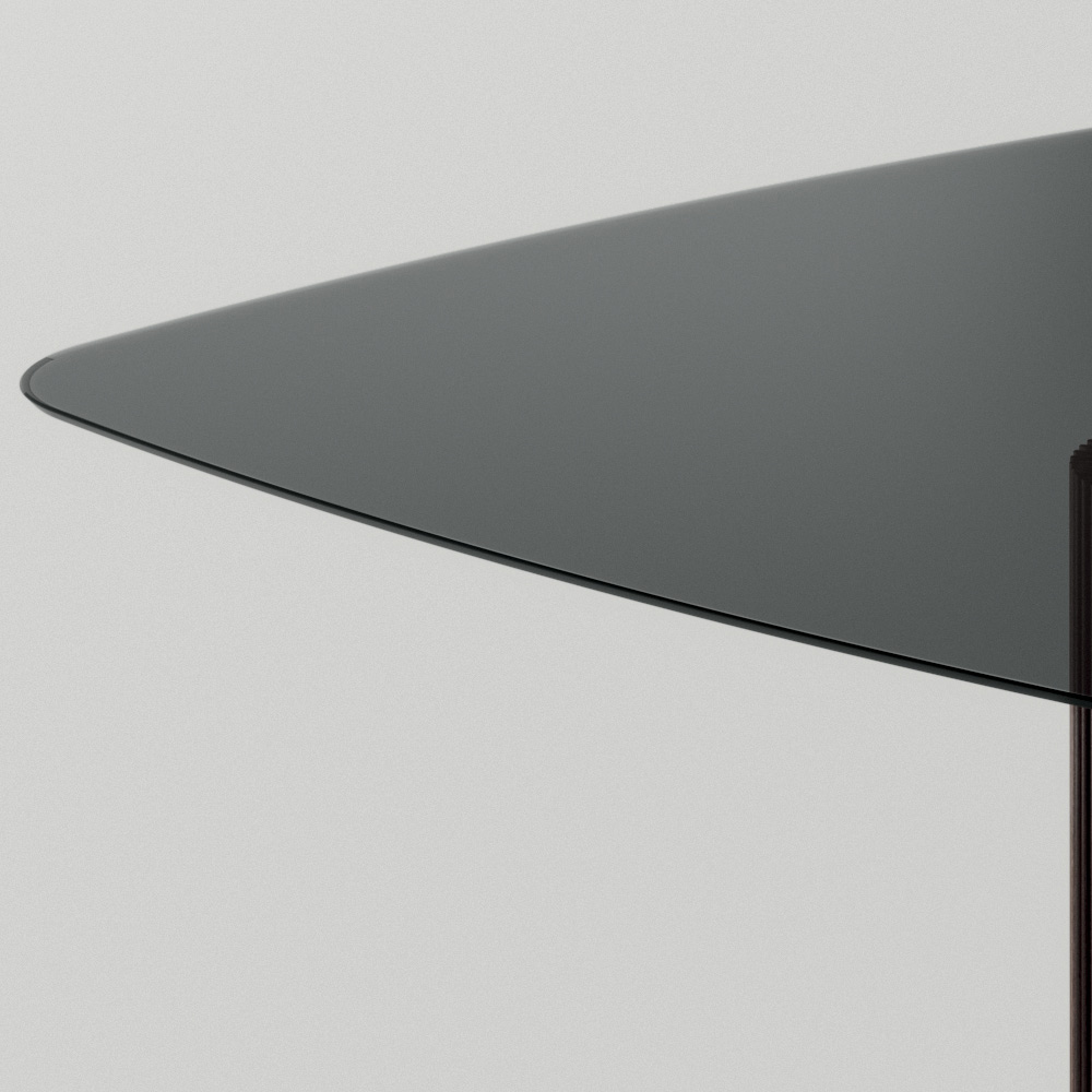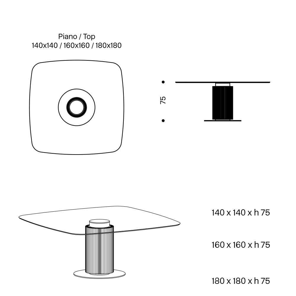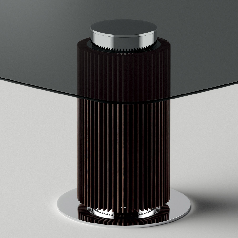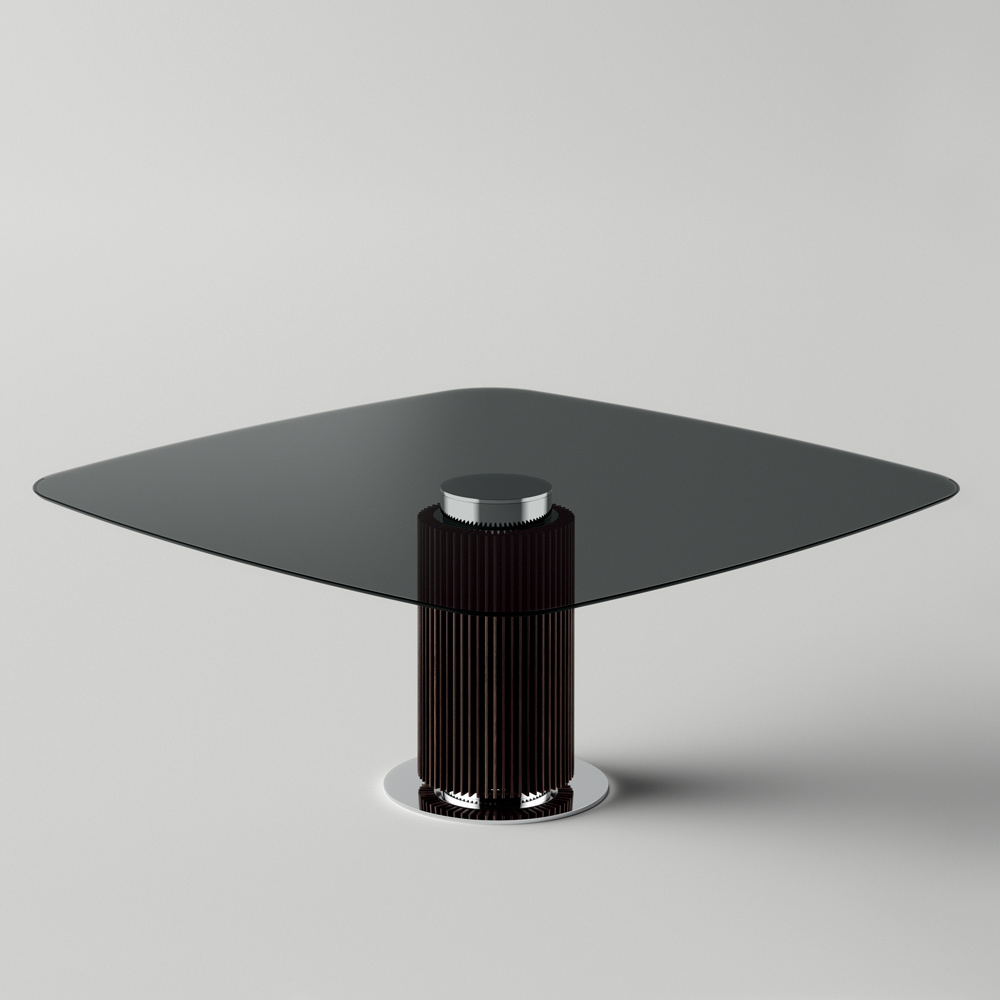طاولة طعام بسطح مربع من الزجاج المُدخّن ، وقاعدة من شرائح خشبية ومعدنية . تكمن نقطة قوتها الجمالية في قاعدتها المعمارية المُكوّنة من شرائح ترتكز على قاعدة معدنية بلمسة نهائية من الكروم اللامع. يُضفي السطح ذو الحافة المُستديرة نعومةً على الأشكال، بينما تُكمل العناصر المعدنية تصميم الطاولة، مُضفيةً عليها طابعًا شخصيًا ومتانةً .