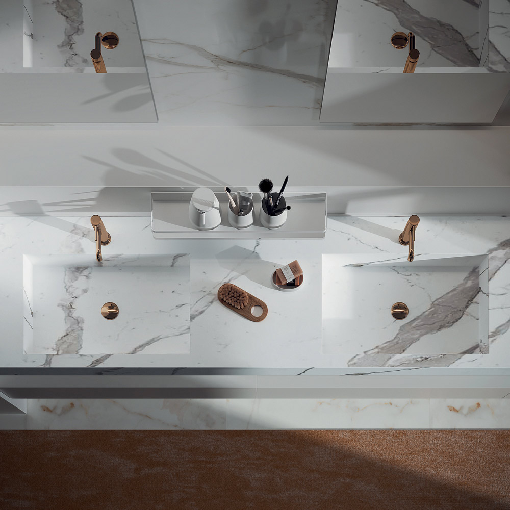 مجموعة حمام مزدوجة مع مرآة زجاجية مستطيلة مزدوجة ، وقاعدة من الميلامين المقاوم للخدش باللون الأبيض اللامع مع ثلاثة أدراج تغلق بسلاسة وسطح من HPL مع حوض مزدوج مدمج بلون كالاكاتا.
