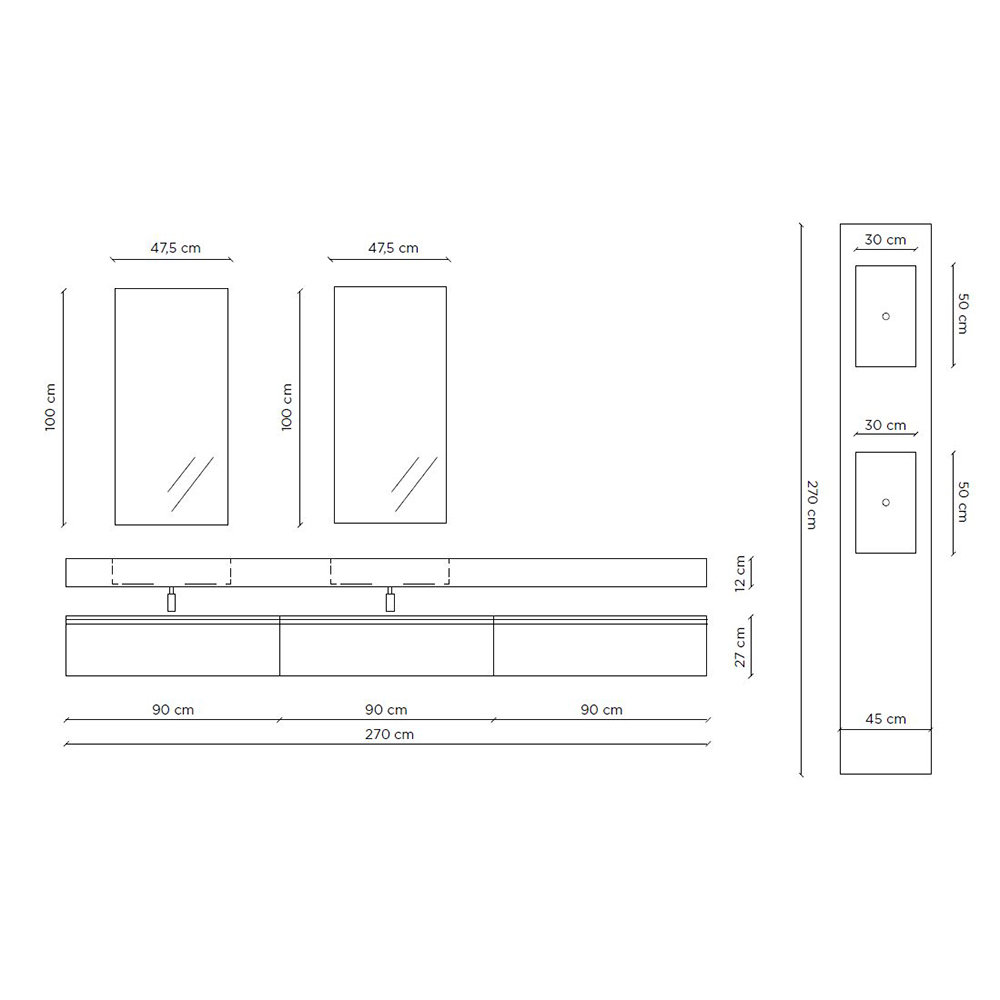 قاعدة عدد 3: الطول 270 سم × الارتفاع 27 سم × العمق 45 سم