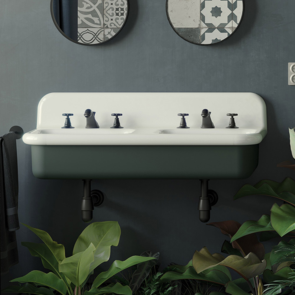 حوض غسيل مزدوج للحمام ذو هيكل مستطيل من السيراميك ثنائي اللون الأبيض غير اللامع والأخضر الغابي.