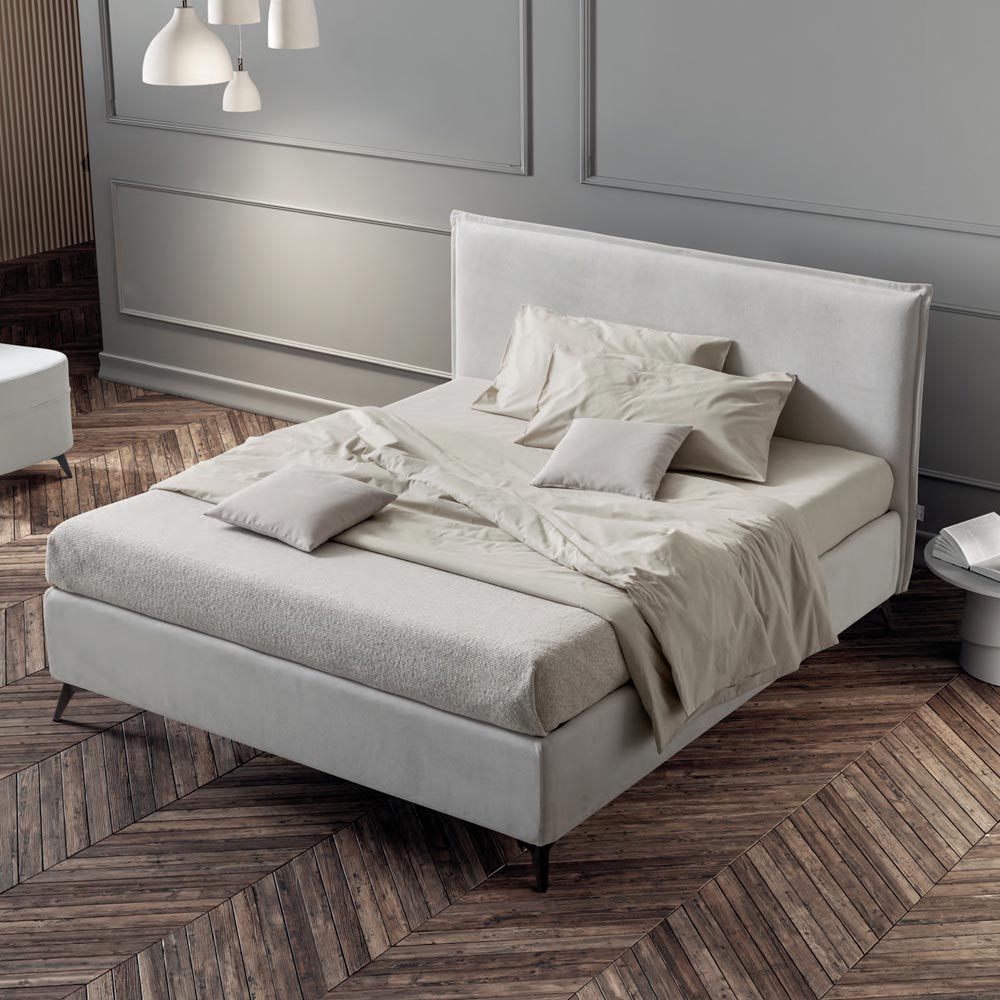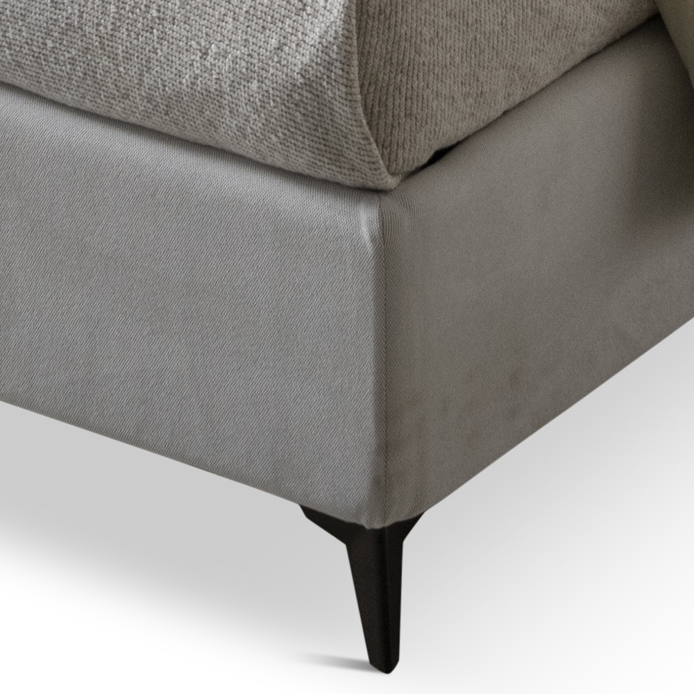 سرير مزدوج مغطى بقماش مقاوم للماء والبقع مع قاعدة ديناميكيةوصندوق تخزين وأقدام معدنية باللون الرمادي (ارتفاع 13.5 سم). هذا السرير هو مثالٌ للراحة والتصميم العصري. إنه مزيجٌ مثاليٌّ من الرقيّوالعملية ، مُصمَّمٌ ليمنحك ليالي من الاسترخاء التامّ وأناقةٍ لا مثيل لها.