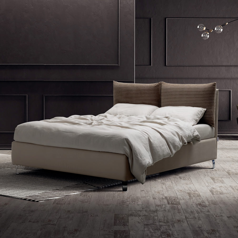 سرير مزدوج بقاعدة ديناميكية ، وصندوق تخزين،وأرجل معدنية بلمسة نهائية من الفولاذ المصقول (ارتفاع ١٢ سم)، ولوح رأس مصنوع من وسادتين ناعمتين من قماش صديق للبيئة وصديق للبيئة، على عكس السرير المصنوع من قماش مقاوم للماء. الوسائد مثبتة على الإطار بشريط فيلكرو لاصق عملي، مما يتيح إزالتها بسهولة ويسر. هذا السرير هو مثالٌ للراحة والتصميم العصري. إنه مزيجٌ مثاليٌّ من الأناقةوالعملية ، مصممٌ ليمنحك ليالي من الاسترخاء التام وأناقةٍ لا مثيل لها.