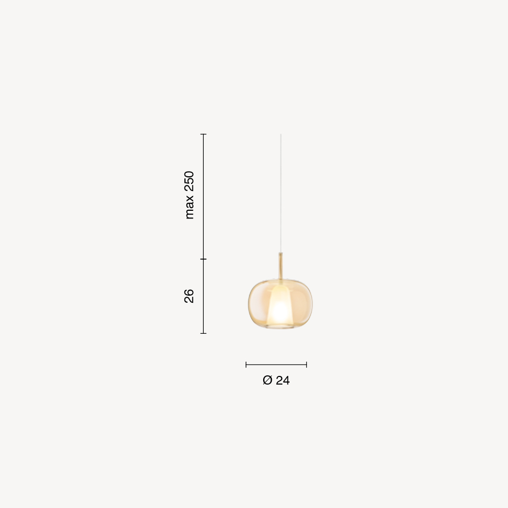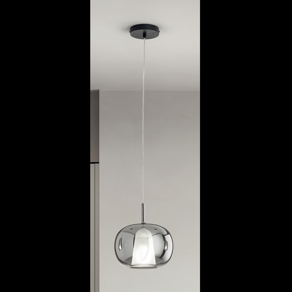 مصباح مصنوع من قاعدة سقف معدنية وموزع زجاجي منفوخ ، يتميز بطبقتين: داخلية من زجاج ساتان وخارجية من زجاج ملون . غطاء من مادة بوليمرية لتثبيت الكابل في موضع مركزي. كابل قابل للتعديل.