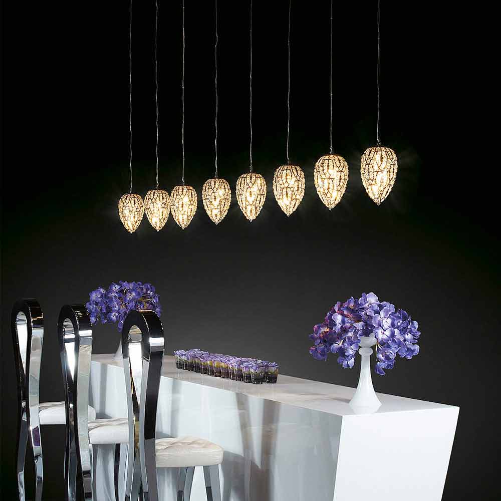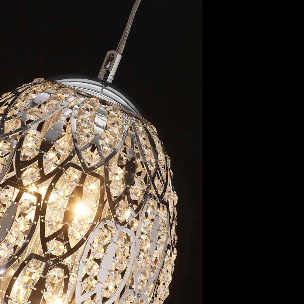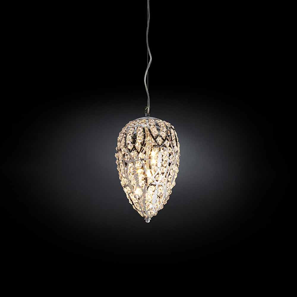 مصباح كريستالي على شكل بيضة، تصميم عصري. مصباح كريستالي أنيق على شكل بيضة، بتصميم فريد. المصباح مصنوع من لحام عدة قطع من شبكة فولاذية، مطلي بالكروم. إن بلورات العصفور، التي يتم تثبيتها على المصباح يدويًا، تجعل البيضة أكثر تميزًا.